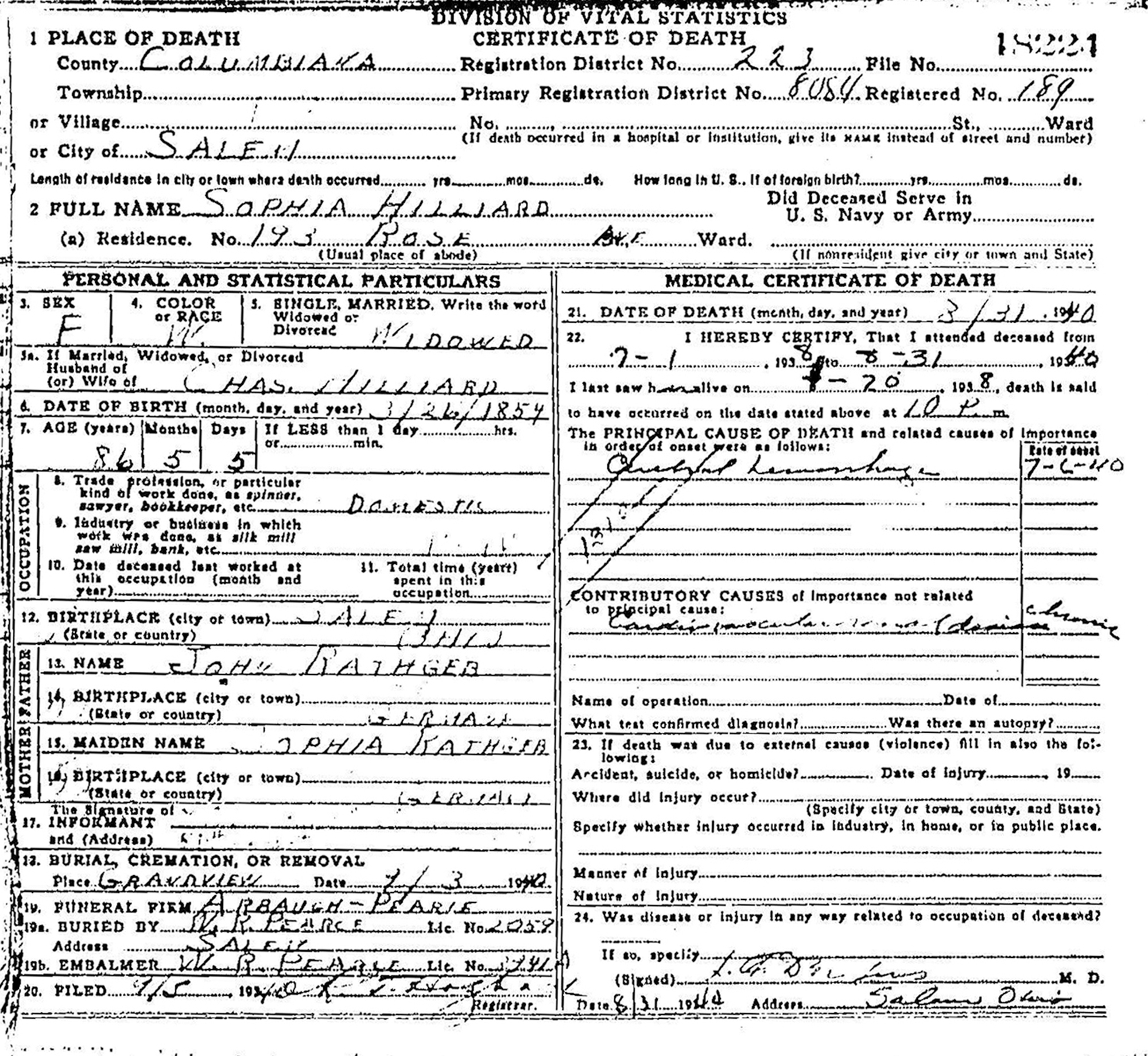 2 "Ohio Deaths, 1908-1953," database with images, FamilySearch.org (accessed 23 Feb 2014), Name: Sophia Hilliard; Event Date: 31 Aug 1940; Event Place: Salem, Columbiana, Ohio.
