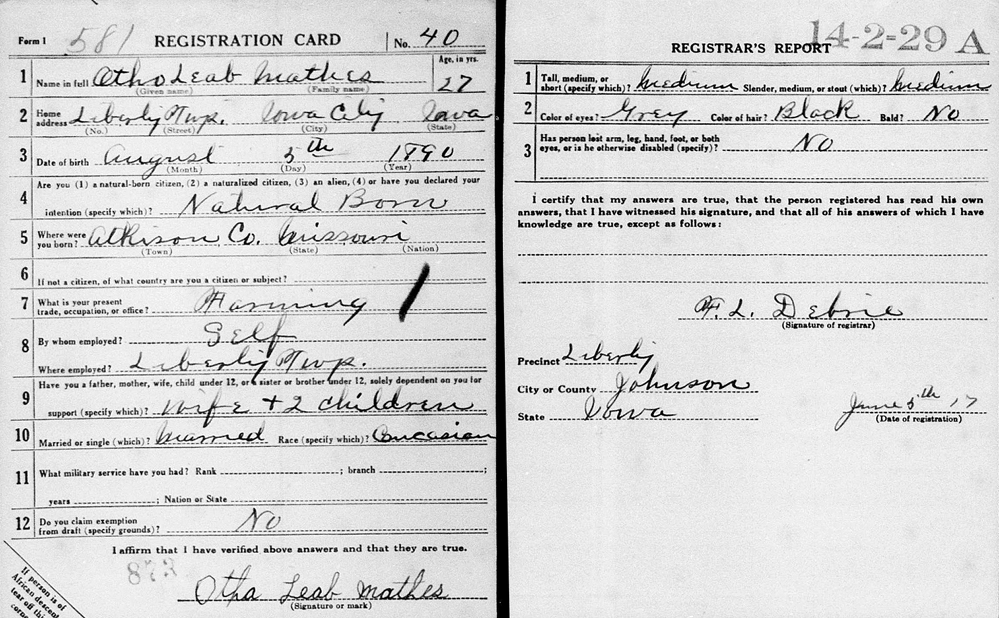 9 "United States World War I Draft Registration Cards, 1917-1918," database with images, FamilySearch.org (accessed 23 Sep 2014); Name: Otho Leab Mathes; Event Place: Johnson County, Iowa, United States.