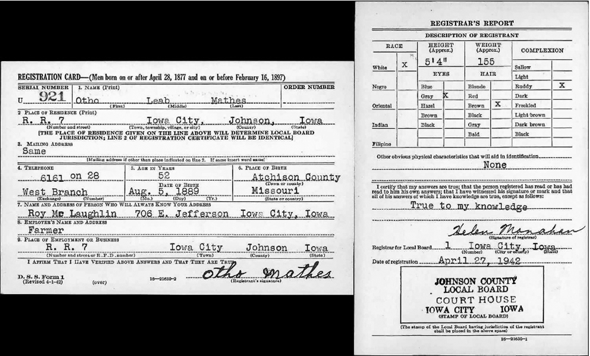 • Otho Leob Mathes registered for WW II Draft: 27 April 1942, Iowa City, IA. • He resided at R.R. 7 In Iowa City, IA.