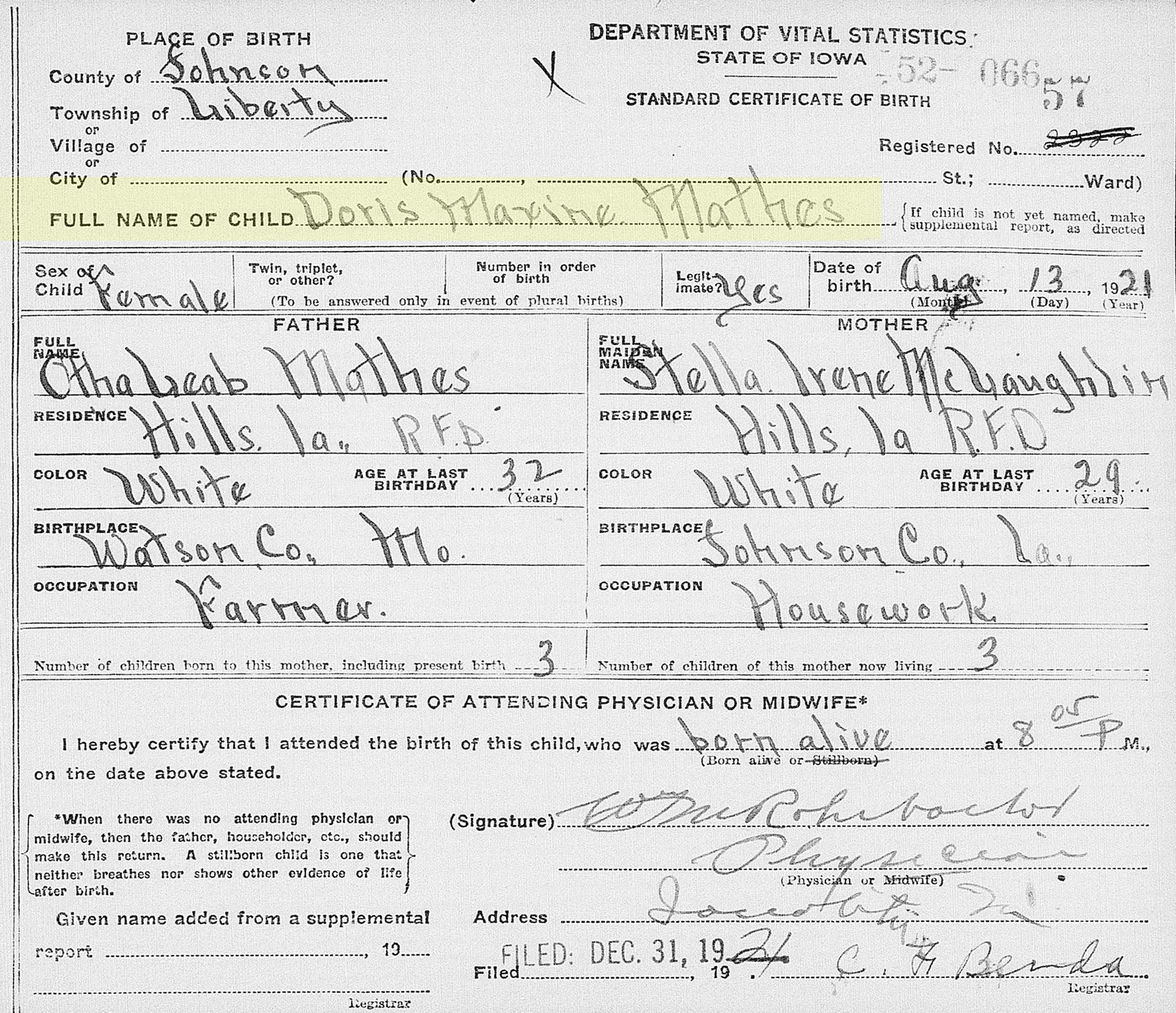 1 "Iowa, Birth Records, 1921-1942," database, FamilySearch (https://www.familysearch.org/search/collection/2849548 : accessed 24 October 2020), Doris Maxine Mathes, 13 Aug 1921; citing Birth, Liberty Township, Johnson, Iowa, United States, State Historical Society of Iowa, Des Moines.