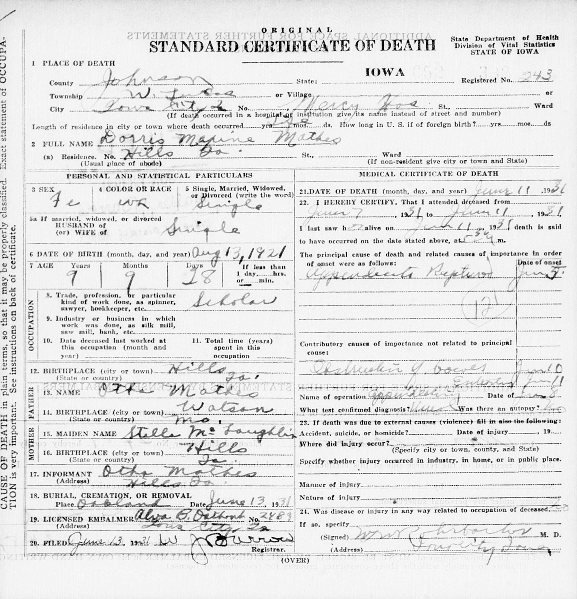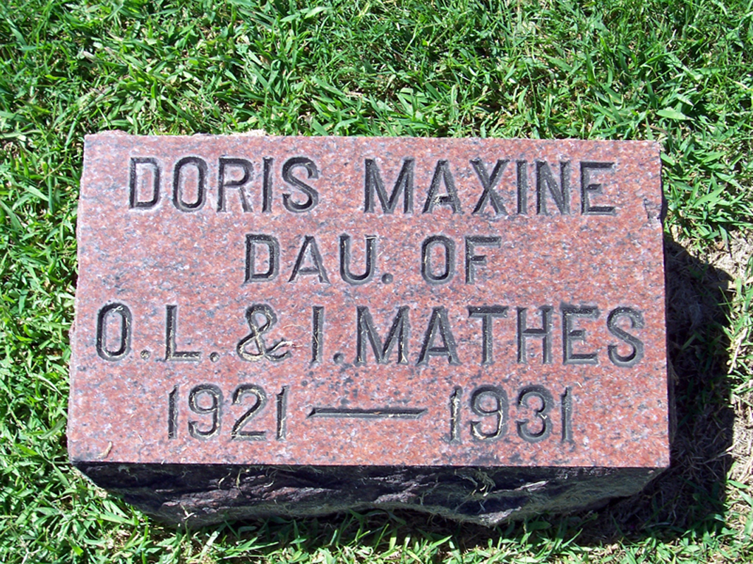 Find A Grave, database and images (https://www.findagrave.com/ ); (accessed 02 December 2019), memorial page for Doris Maxine Mathes (13 Aug 1921-11 Jun 1931), Find A Grave Memorial no. 106816496, citing Oakland Cemetery, Iowa City, Johnson County, Iowa, USA
