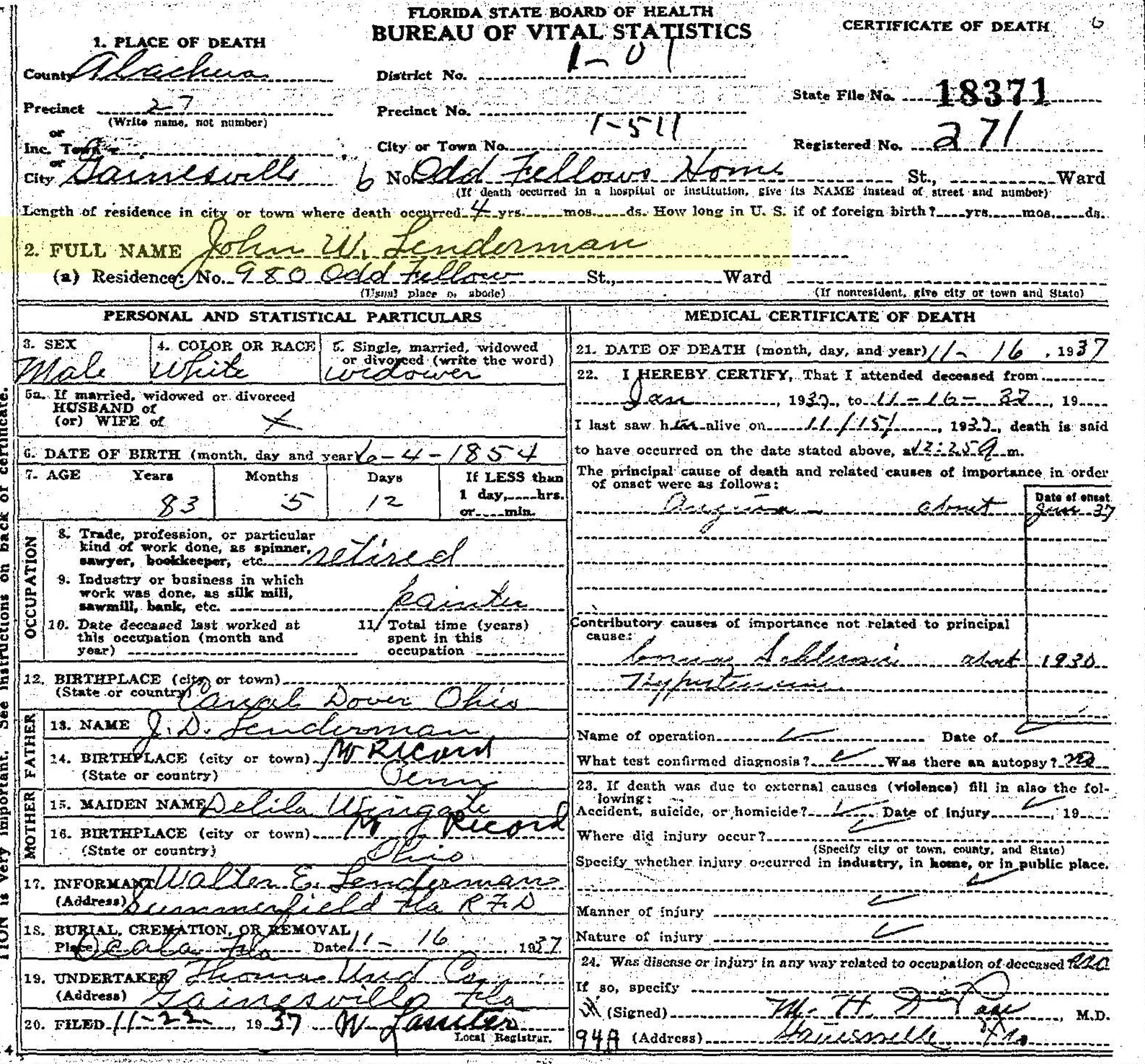3 "Florida Deaths, 1877-1939," database, FamilySearch (accessed 28 August 2021), (https://familysearch.org/ark:/61903/1:1:FP3Y-7RM : 23 February 2021), John W. Lenderman, 1937.