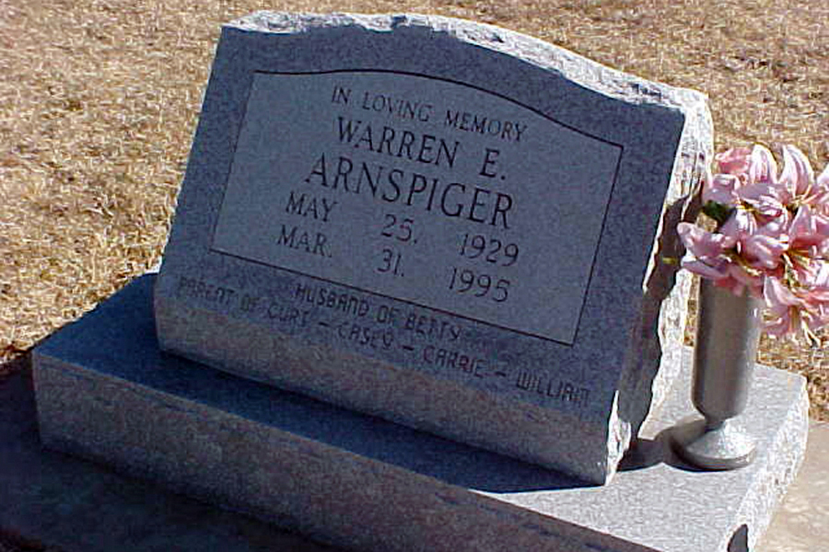 "United States Social Security Death Index," database, FamilySearch (accessed 17 December 2020), (https://www.familysearch.org/ark:/61903/1:1:J5C9-G27 : 4 December 2020), Warren E Arnspiger, 15 Mar 1995; citing U.S. Social Security Administration, Death Master File, database (Alexandria, Virginia: National Technical Information Service, ongoing).