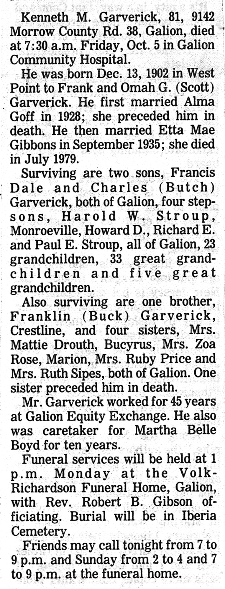 • His obituary was published in the Telegraph-Forum on 6 October 1984 in Iberia, OH. Kenneth married Etta Mae Gibbons, daughter of Lewis Bliss Gibbons and Estella Anna Rife, in September 1935. (Etta Mae Gibbons was born on 10 August 1905 in Galion, OH,1 2 3 died on 31 July 1979 in Galion, OH 3 and was buried on 3 August 1979 in Iberia, OH 3.) |