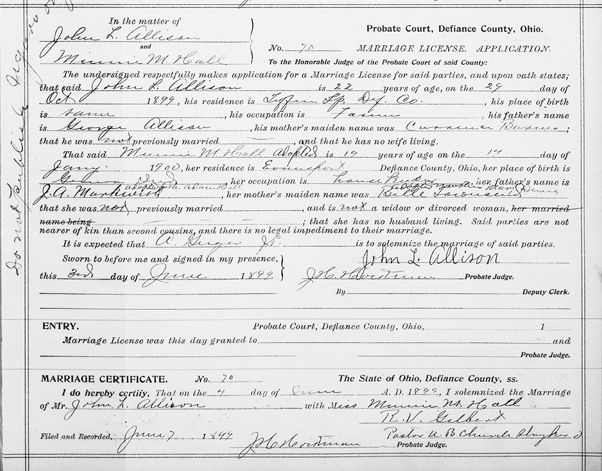 1 1900 U.S. census, population schedule, Tiffin Township, Defiance County, Ohio, enumeration district (ED) 18, sheet 10B, dwelling 196, family 199, John L. Allison and Minnie Myrtle Paul; index and images, FamilySearch.org (accessed 30 Aug 2016); citing National Archives and Records Administration microfilm T623, roll 1263.