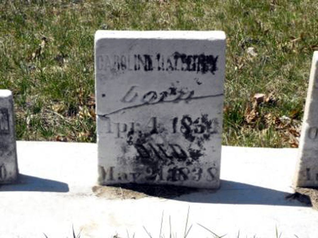 1 Find A Grave, database and images (https://www.findagrave.com/ ); (accessed 05 September 2019), memorial page for Caroline Halferty (4 Apr 1834\endash 21 May 1838), Find A Grave Memorial no. 37093579, citing Wilson Pioneer Cemetery, Fort Madison, Lee County, Iowa, USA