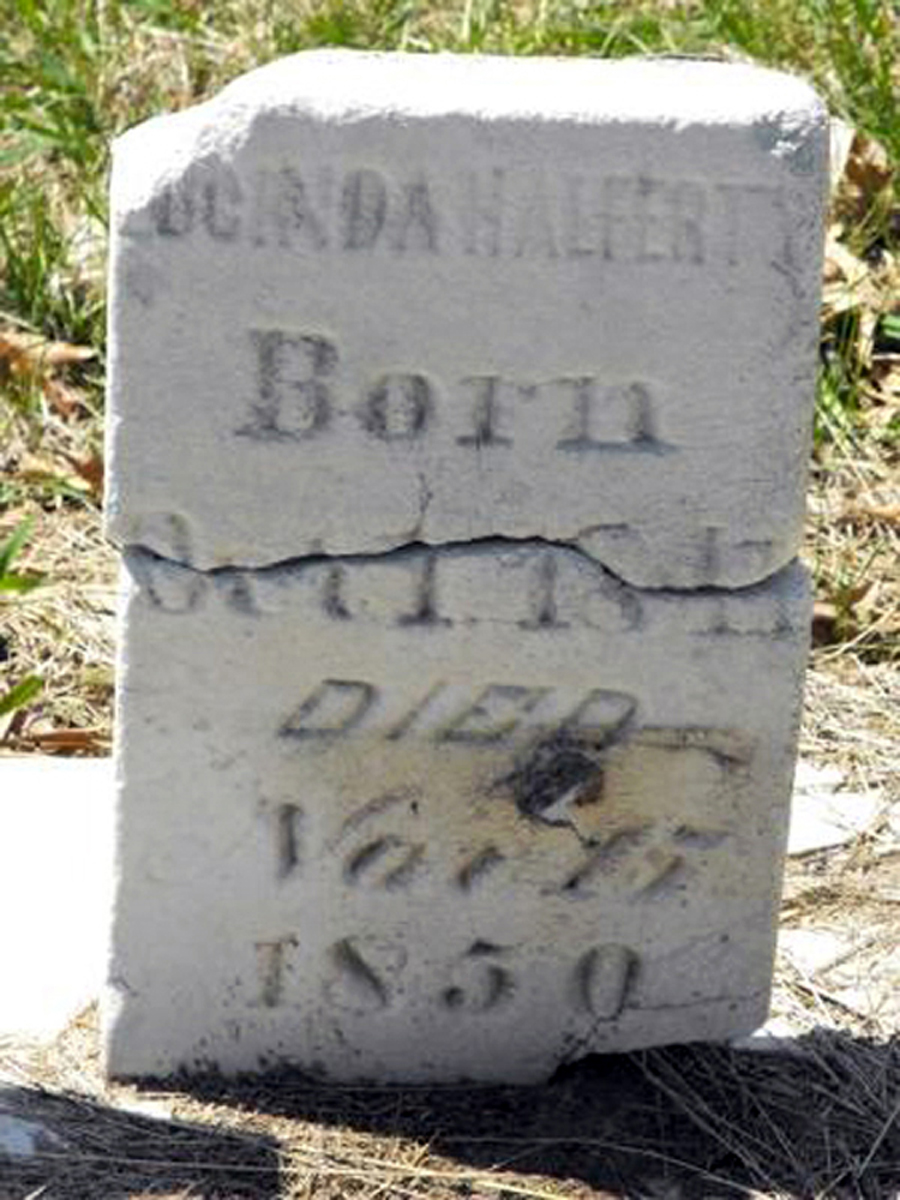 3 Find A Grave, database and images (https://www.findagrave.com/ ); accessed 05 March 2019), memorial page for Lucinda Halferty (1 Oct 1847\endash 15 Nov 1850), Find A Grave Memorial no. 37093774, citing Wilson Pioneer Cemetery, Fort Madison, Lee County, Iowa, USA