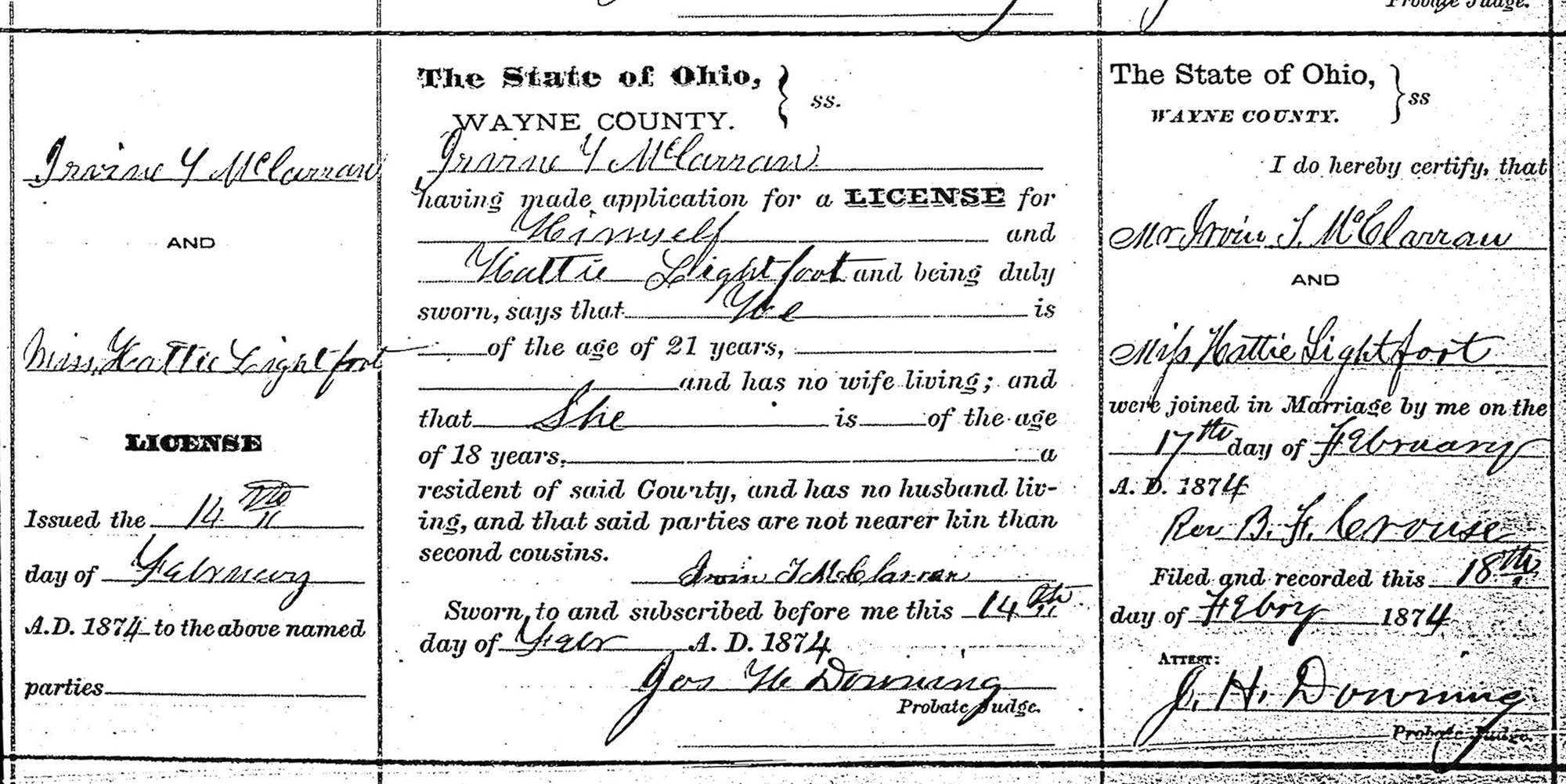 3 1880 U.S. census, population schedule, Wooster Township, Wayne County, Ohio, enumeration district (ED) 239, p. 355B, dwelling 10, family 11, Irvin T. McClarran and Harriet L. Lightfoot; index and images, FamilySearch.org (accessed 3 Aug 2016); citing National Archives and Records Administration microfilm T9, roll 1077.