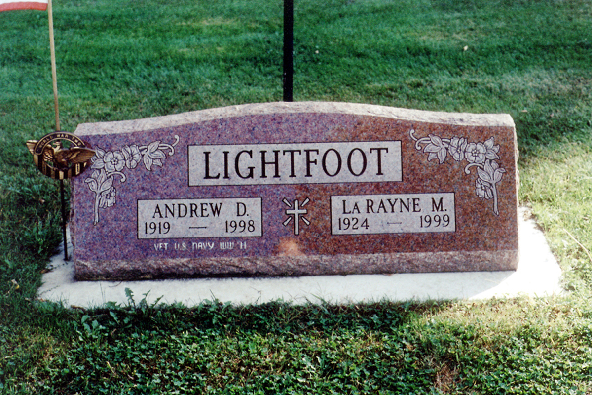 • She was buried after 5 January 1999 in the Forest Hill Cemetery in Eau Claire, WI. La married Andrew David Lightfoot, son of Charles Clay Lightfoot and Rosalie Stoops, on 16 February 1946 in Chicago, IL.1 (Andrew David Lightfoot was born on 8 December 1919 in Wisconsin,1 4 5 6 7 died on 5 February 1998 in Eau Claire, WI 1 7 and was buried on 9 February 1998 in Forest Hill Cemetery, Eau Claire, WI 8.). The cause of his death was acute pneumonia. |