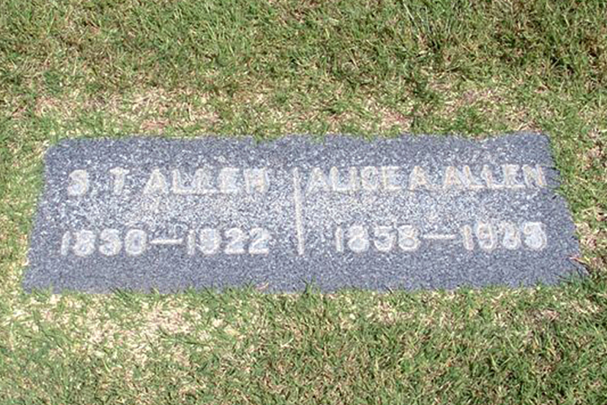 • She was buried in 1935 in the Valley Center Cemetery in Valley Center, CA. Alice married Samuel Thompson Allen, son of Ira Ellis Allen and Nancy Yelton, on 3 August 1873 in , Marshall County, IN.1 2 3 (Samuel Thompson Allen was born on 1 August 1850 in Argos, IN,1 2 3 8 died on 23 February 1922 in California 8 and was buried after 23 February 1922 in Valley Center, CA 8.)