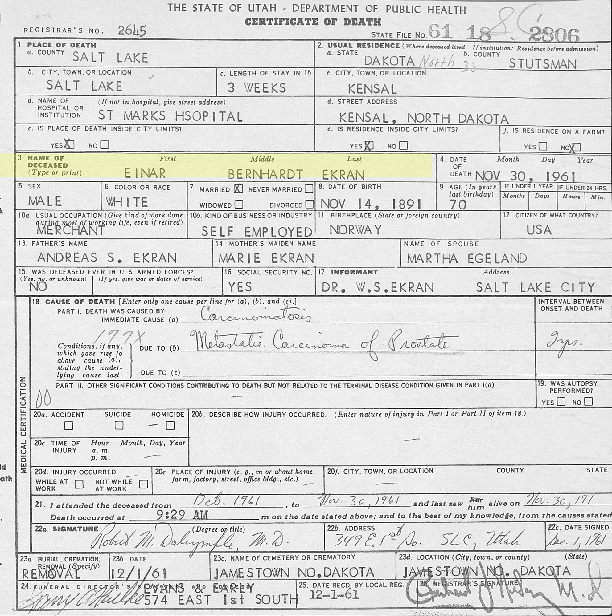 3 "Utah Death Certificates, 1904-1965," database with images, FamilySearch (https://familysearch.org/search/collection/1747615 : accessed 11 November 2020); (https://familysearch.org/ark:/61903/1:1:QKDV-8WST : 18 March 2018), Einar Bernhardt Ekran, 30 Nov 1961; citing Salt Lake City, Salt Lake, Utah, United States, certificate, series 81448; Utah State Archives Research Center, Salt Lake City, Utah; FHL microfilm.