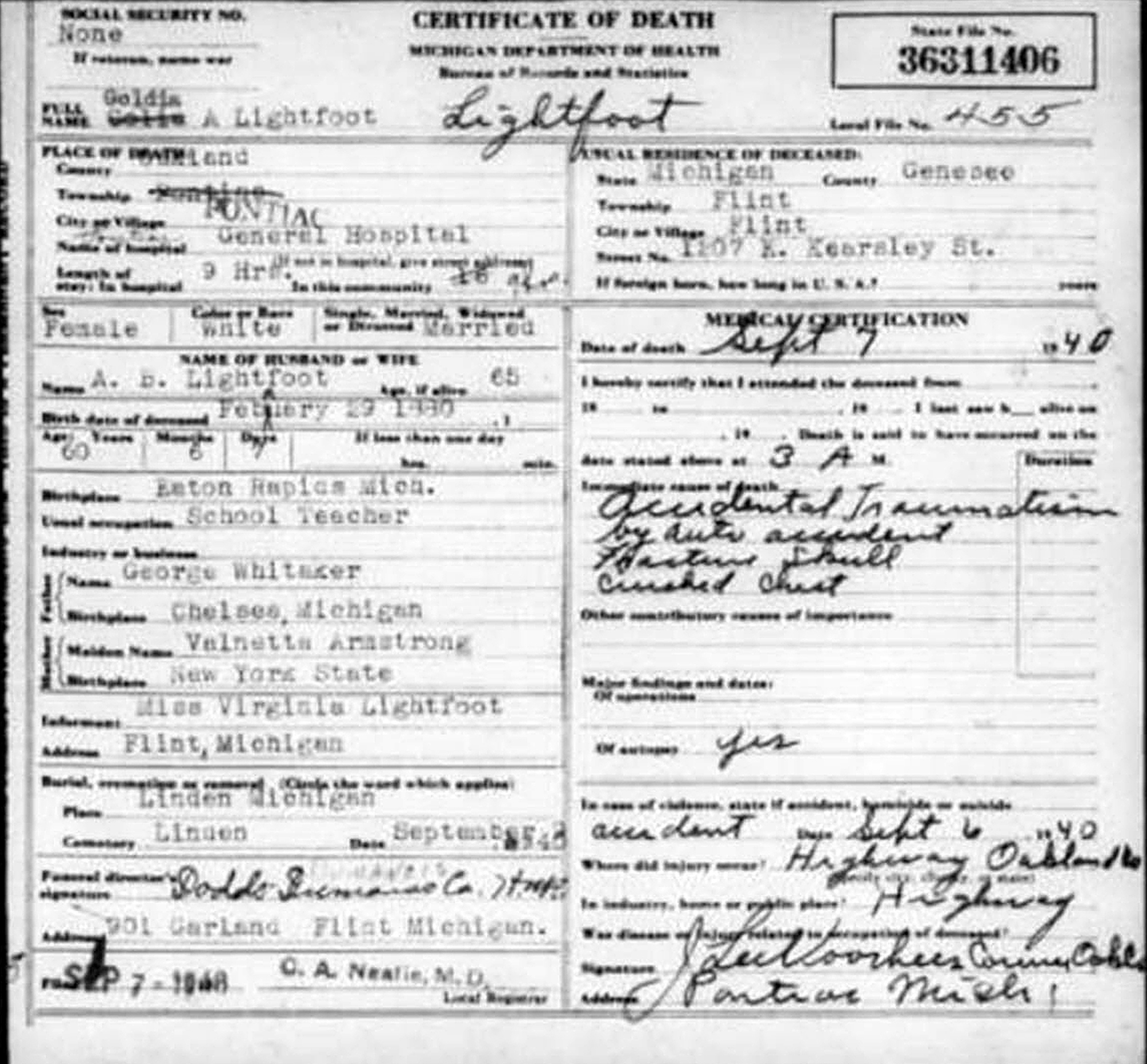 9 "Michigan Death Certificates, 1921-1952," database, FamilySearch.org (accessed 24 August 2020), Goldia A Lightfoot, 07 Sep 1940; citing Pontiac, Oakland, Michigan, United States, Division for Vital Records and Health Statistics, Lansing; FHL microfilm 1,973,057.