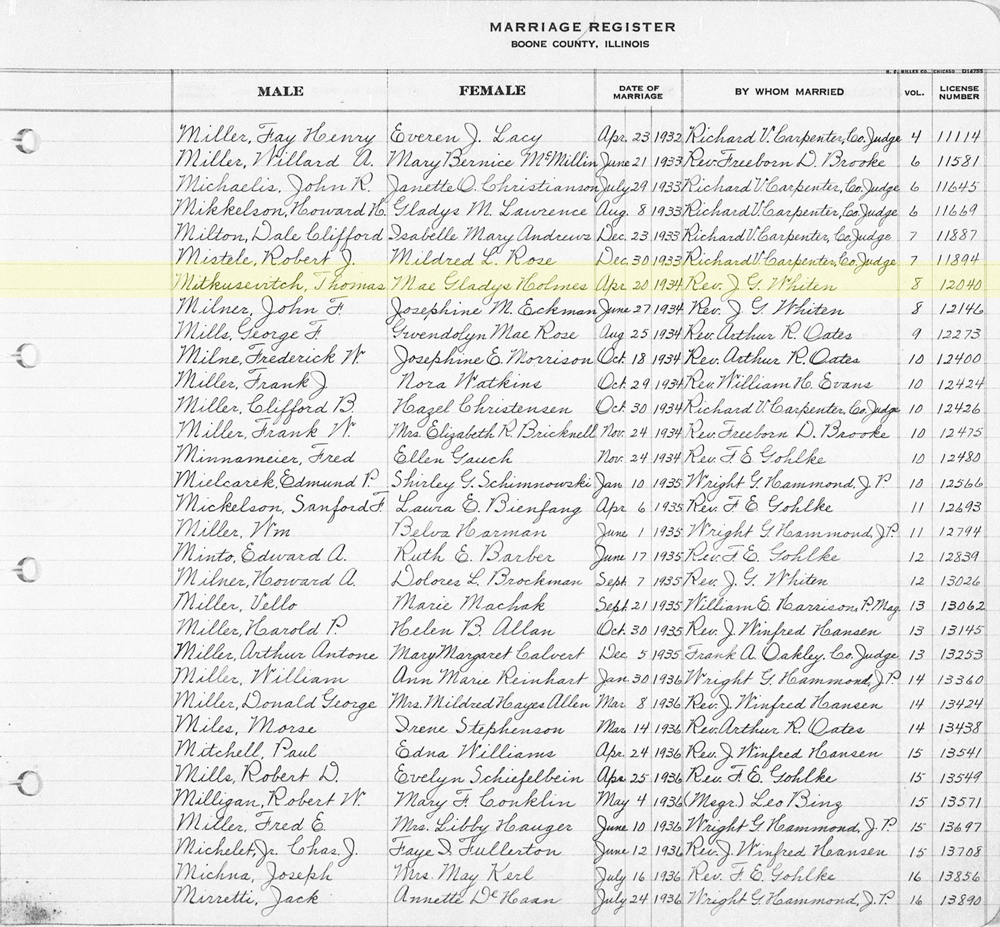 1 "Illinois, County Marriages, 1810-1940," database, FamilySearch (https://www.familysearch.org/search/collection/1803970 : accessed 23 Mar 2020), Thomas Mitkusevitch and Mae Gladys Holmes, 1934; citing Boone, Illinois, United States, county offices, Illinois; FHL microfilm 1,914,103.