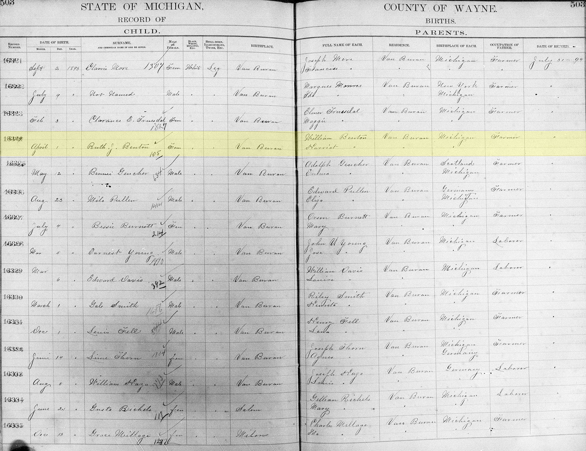 4 "Michigan, County Births, 1867-1917," database with images, FamilySearch (https://www.familysearch.org/search/collection/1923472 : accessed 24 Jun 2020), Ruth J Benton, 1 Apr 1893; citing Birth, various county courts, Michigan.