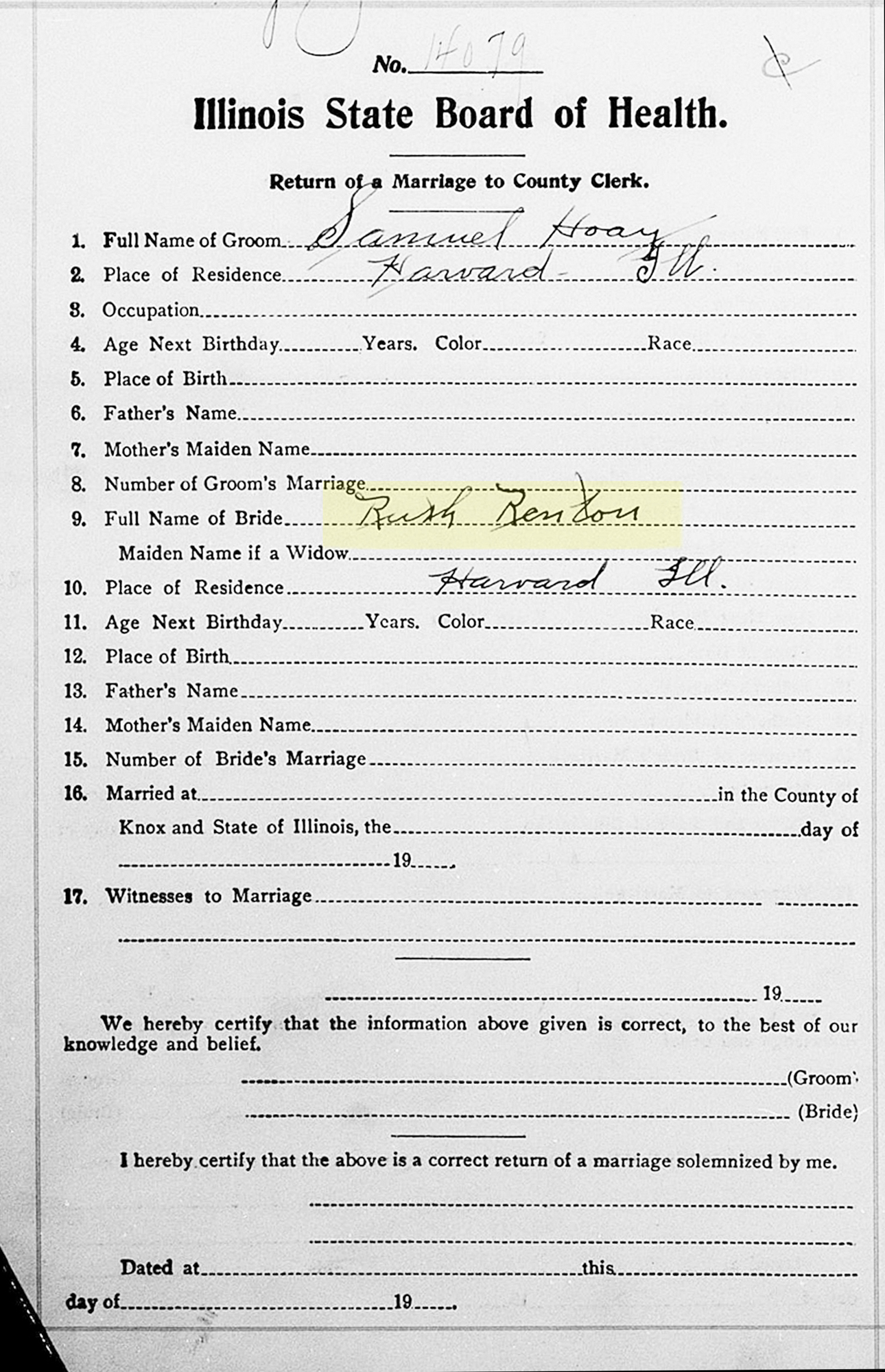 1 "Illinois, County Marriages, 1810-1940," database, FamilySearch (https://www.familysearch.org/search/collection/1803970 : accessed 5 Mar 2020), Samuel Hoay and Ruth Renton, May 1913; citing McHenry, Illinois, United States, county offices, Illinois; FHL microfilm 1,420,737.
