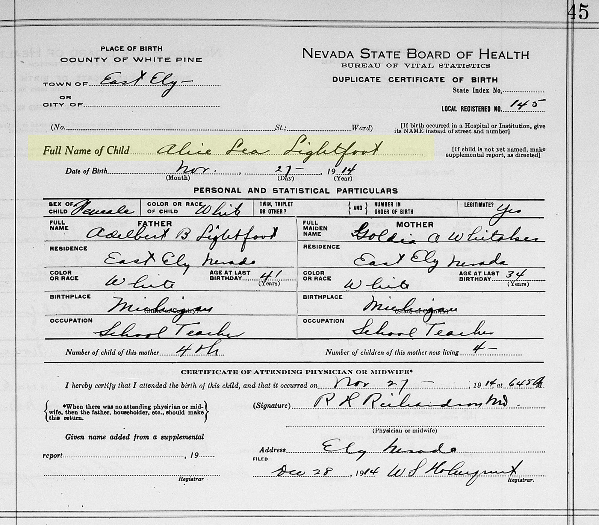 "Nevada County Birth and Death Records, 1871-1992," database with images, FamilySearch (https://www.familysearch.org/search/collection/2053817 : accessed 24 August 2020), Alice Lea Lightfoot, 27 Nov 1914; citing Birth, White Pine, Nevada, United States, 27 Nov 1914, citing county recorder, various counties, Nevada.