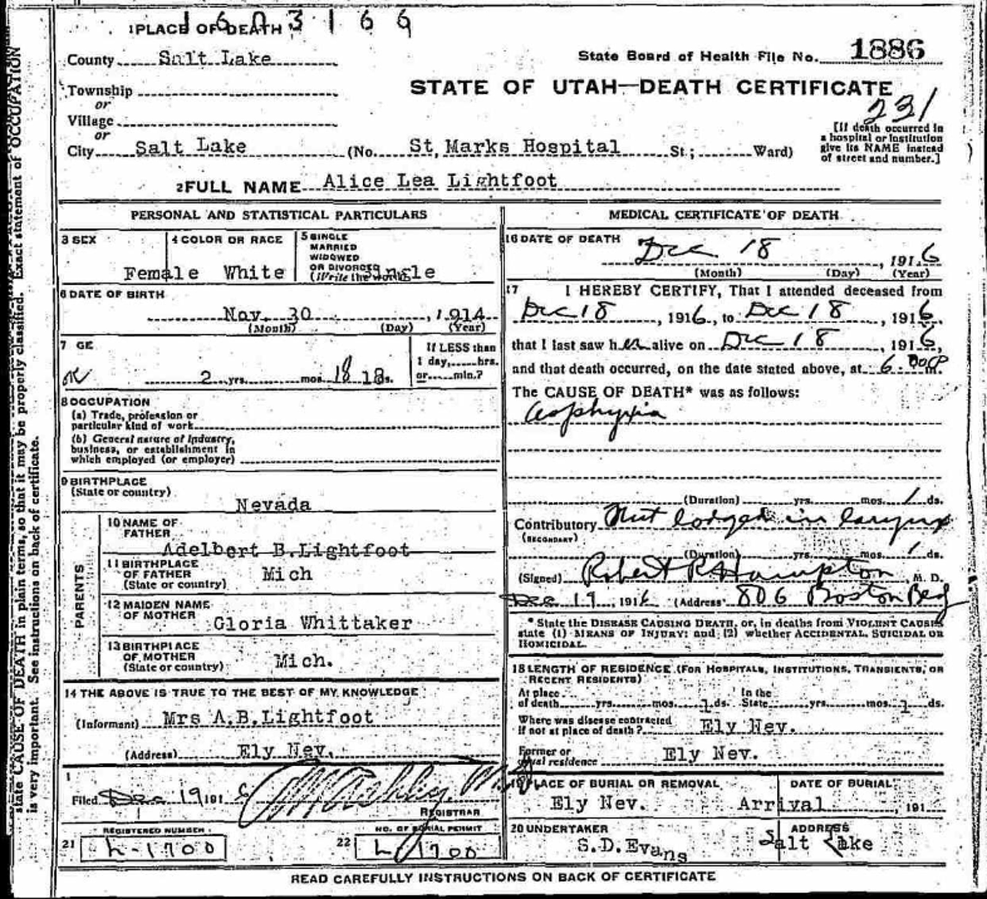 3 "Utah Death Certificates, 1904-1965," database with images, FamilySearch (https://familysearch.org/search/collection/1747615 : accessed 24 August 2020); Alice Lea Lightfoot, 18 Dec 1916; citing Salt Lake City, Salt Lake, Utah, United States, certificate 1886, series 81448; Utah State Archives Research Center, Salt Lake City, Utah; FHL microfilm.