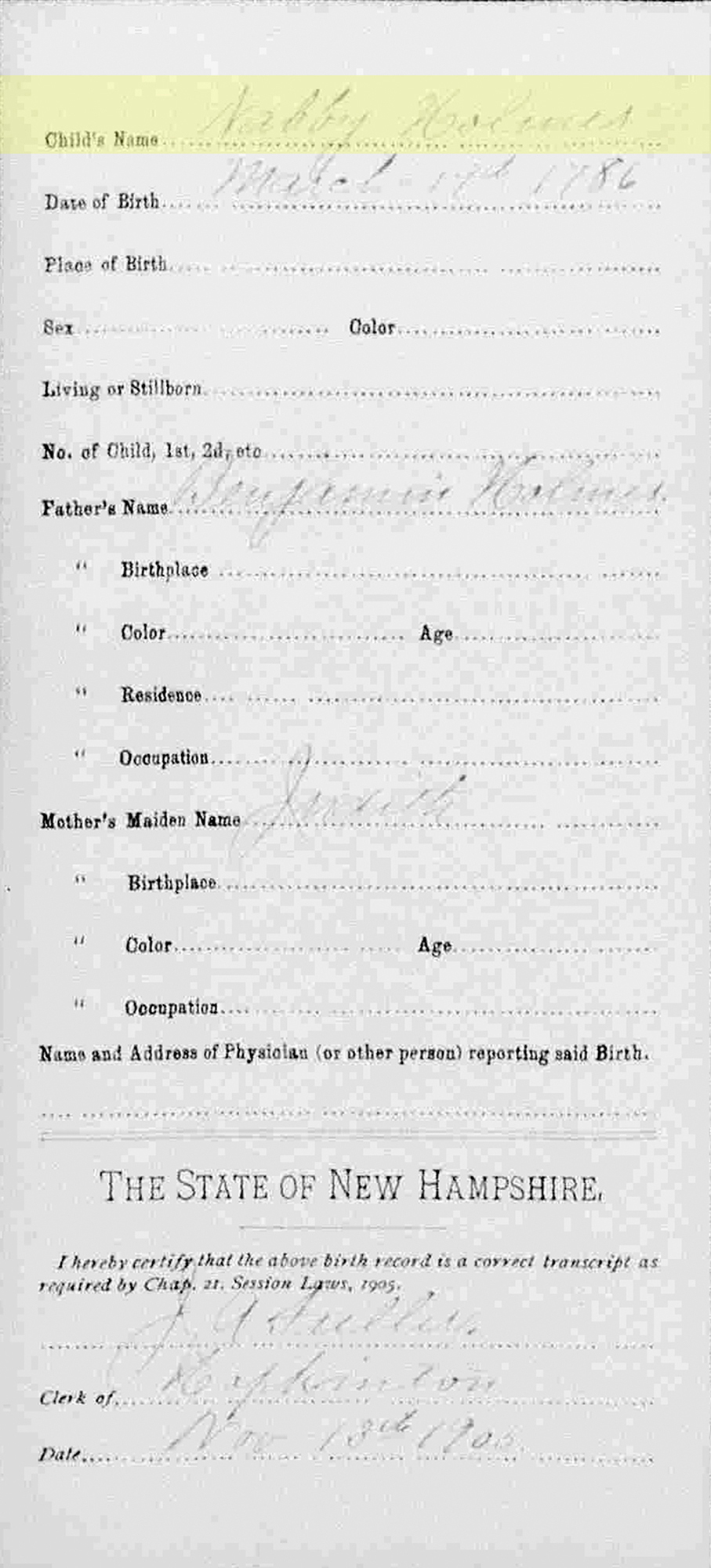 2 "New Hampshire Birth Records, Early to 1900," database with images, FamilySearch (https://www.familysearch.org/search/collection/1542861 : accessed 7 Apr 2020), Nabby Holmes, 19 Mar 1786; citing Hopkinton, Hillsborough, New Hampshire, United States, Bureau of Vital Records and Health Statistics, Concord; FHL microfilm 1,001,002.