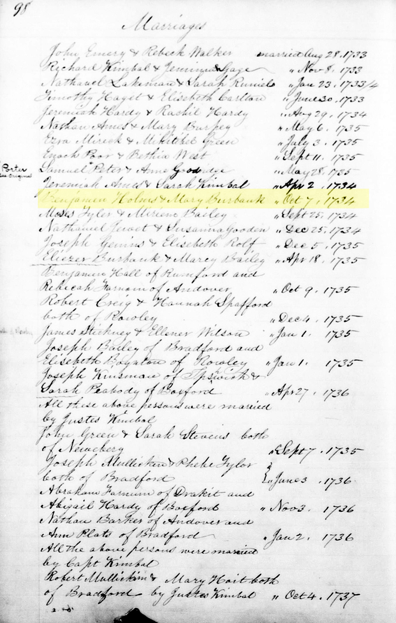 1 "Massachusetts, Town Clerk, Vital and Town Records, 1626-2001," database with images, FamilySearch (https://www.familysearch.org/search/collection/2061550 : accessed 12 Jun 2020), Benjamin Holms and Mary Burbank, 29 Sep 1734; citing Marriage, Rowley, Essex, Massachusetts, United States, Massachusetts Secretary of the Commonwealth, Boston; FHL microfilm 007009689.