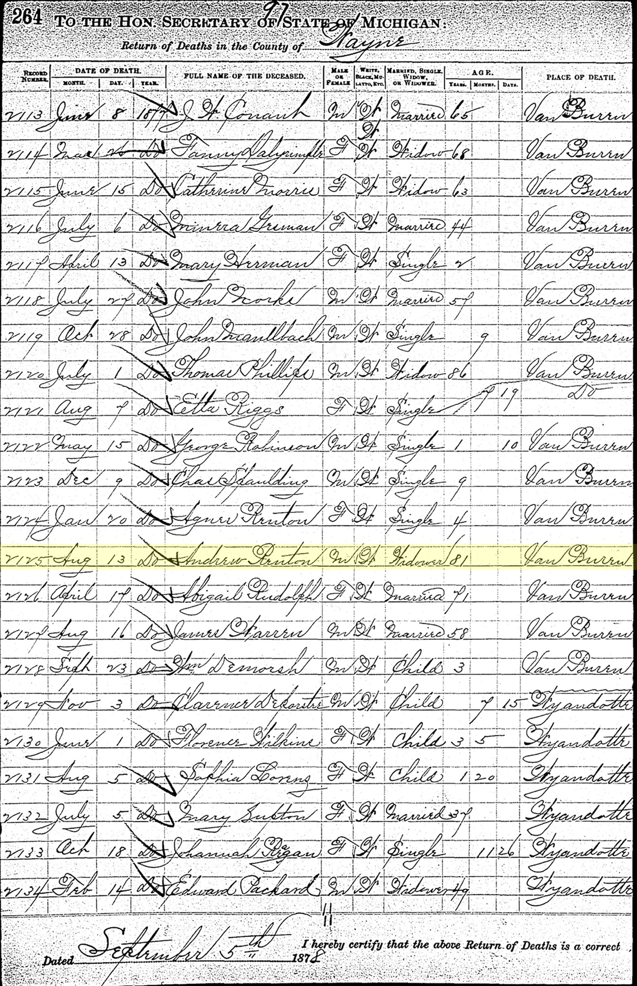 Name: Andrew Renton Event Type: Death Event Date: 13 Aug 1877 Event Place: Van Buren Township, Wayne, Michigan, United States Event Place (Original): Van Buren Township Wayne Co, Michigan, United States Residence Place: Scotland Gender: Male Age: 81 Marital Status: Widowed Ethnicity: American Race: W Occupation: Farmer Birth Year (Estimated): 1796 Birthplace: Scotland Record Number: 28