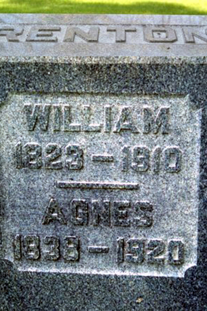 • She was buried after 26 March 1920 in the Otisville Cemetery in Belleville, MI. Agnes married William Renton, son of Andrew Renton and Agnes Wallace, on 4 March 1861.1 2 3 4 (William Renton was born on 10 June 1823 in Innerwick, East Lothian, Scotland 2 4 10 11 12, baptized on 6 July 1823 in Innerwick, East Lothian, Scotland,13 died on 28 December 1910 in Belleville, MI 11 12 and was buried after 28 December 1910 in Belleville, MI 12.)