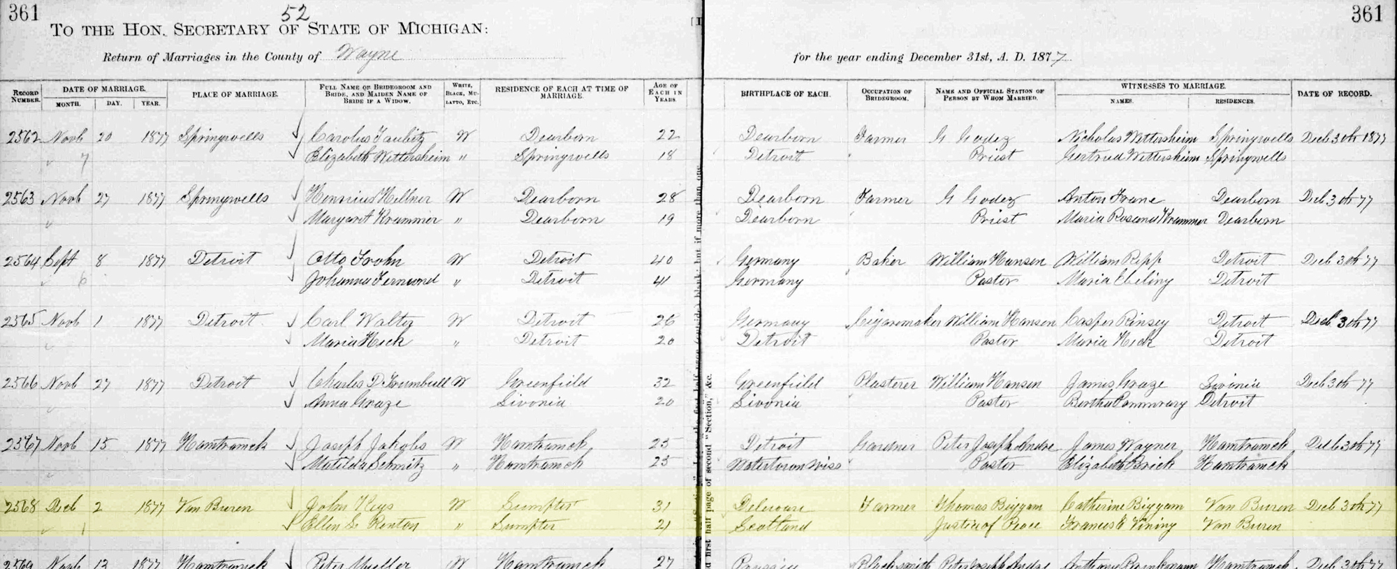 • Marriage Image: 2 December 1877, in Van Buren Township, Wayne County, MI. 1 • They appeared on the 1900 US Census in Huron Township, Wayne, MI on 5 June 1900. 2