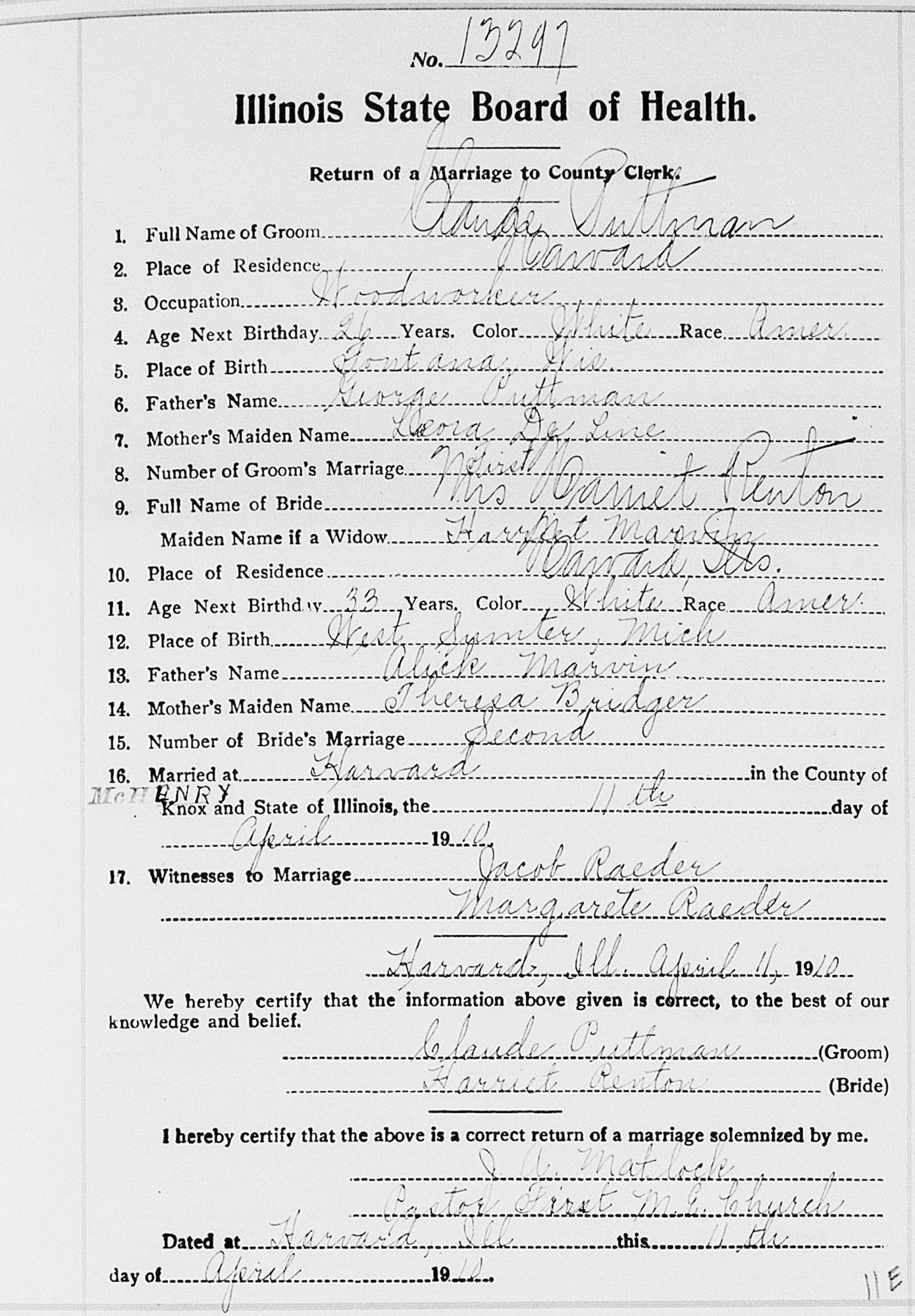 1 "Illinois, County Marriages, 1810-1940," database, FamilySearch (https://www.familysearch.org/search/collection/1803970 : accessed 4 Mar 2020), Claude Puttman and Harriet Renton, 11 Apr 1910; citing McHenry, Illinois, United States, county offices, Illinois; FHL microfilm 1,420,737.