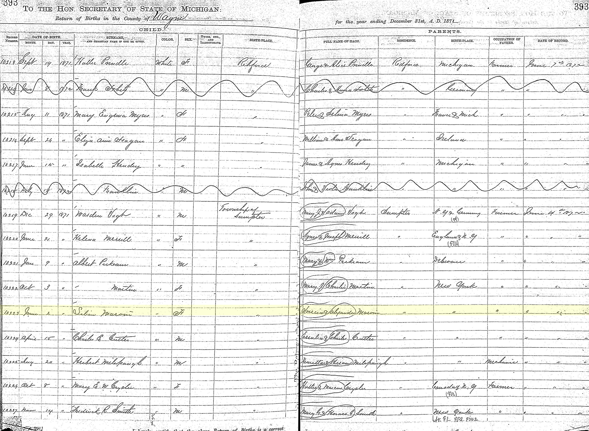 1 "Michigan Births, 1867-1902," database with images, FamilySearch.org (accessed 30 Nov 2019); Lilian Marvin, 02 Jun 1871; citing item 1 p 393 rn 10223, Sumpter Township, Wayne, Michigan, Department of Vital Records, Lansing; FHL microfilm 2,297,930.