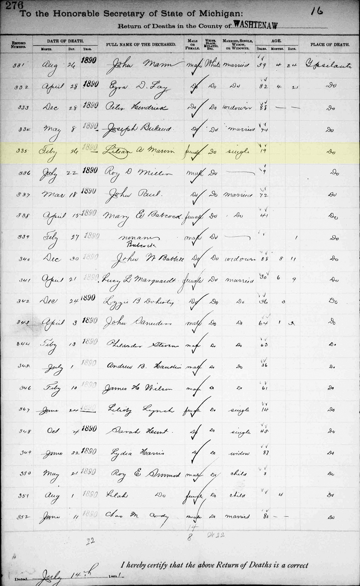 "Michigan Deaths, 1867-1897," database with images, FamilySearch (https://www.familysearch.org/search/collection/1452402 : accessed 30 Nov 2019), Lilian A. Marvin, 26 Feb 1890; citing p 276 rn 335, Ypsilanti, Washtenaw, Michigan, Department of Vital Records, Lansing; FHL microfilm 2,363,828.