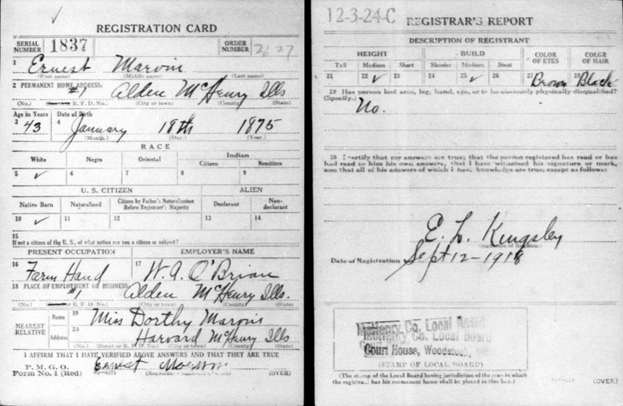 3 "United States World War I Draft Registration Cards, 1917-1918," database with images, FamilySearch.org (accessed 28 Dec 2018); Ernest R. Marvin.