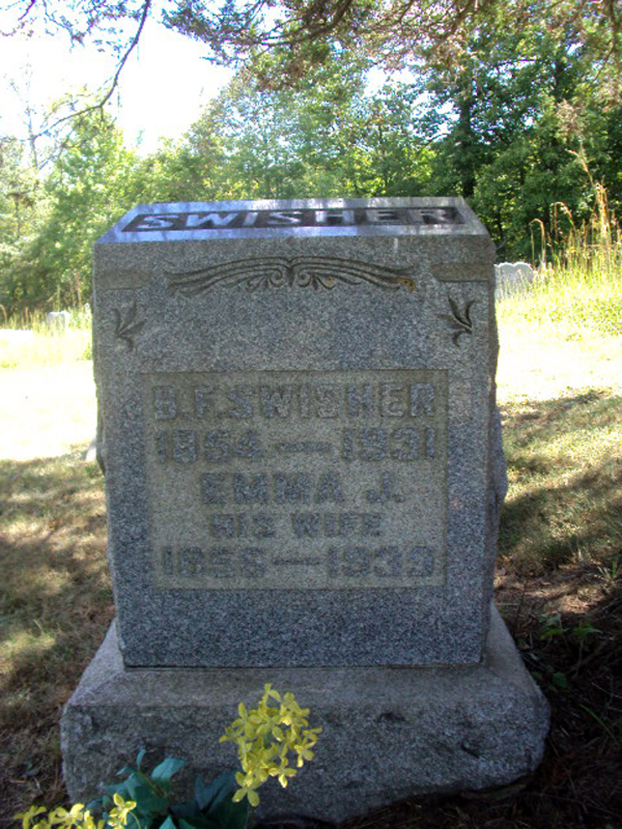 11 Find A Grave, database and images (https://www.findagrave.com/ ); accessed 17 August 2021, memorial page for Emma J. Grubb Swisher (27 Apr 1856-7 Aug 1930), Find a Grave Memorial ID 87465555, citing Mount Zion Cemetery, Fairmont, Marion County, West Virginia, USA