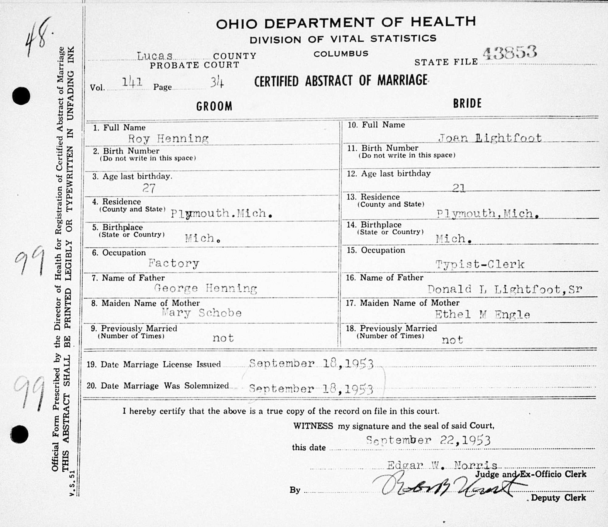 2 "Ohio, County Marriages, 1789-2016," database with images, FamilySearch.org (accessed 28 August 2020); Roy Henning and Joan Lightfoot, 22 Sep 1953; citing Marriage, Lucas, Ohio, United States, Franklin County Genealogical & Historical Society, Columbus; FHL microfilm.