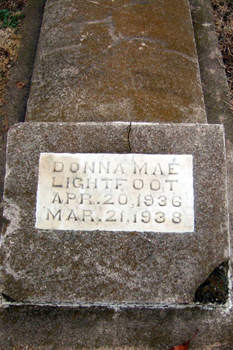 1 "Texas Deaths, 1890-1976," database with images, FamilySearch (https://familysearch.org/search/collection/1983324 : accessed 17 Nov 2013); Name: Donna Mae Lightfoot; Event Date: 21 Mar 1938; Event Place: Houston, Harris, Texas.