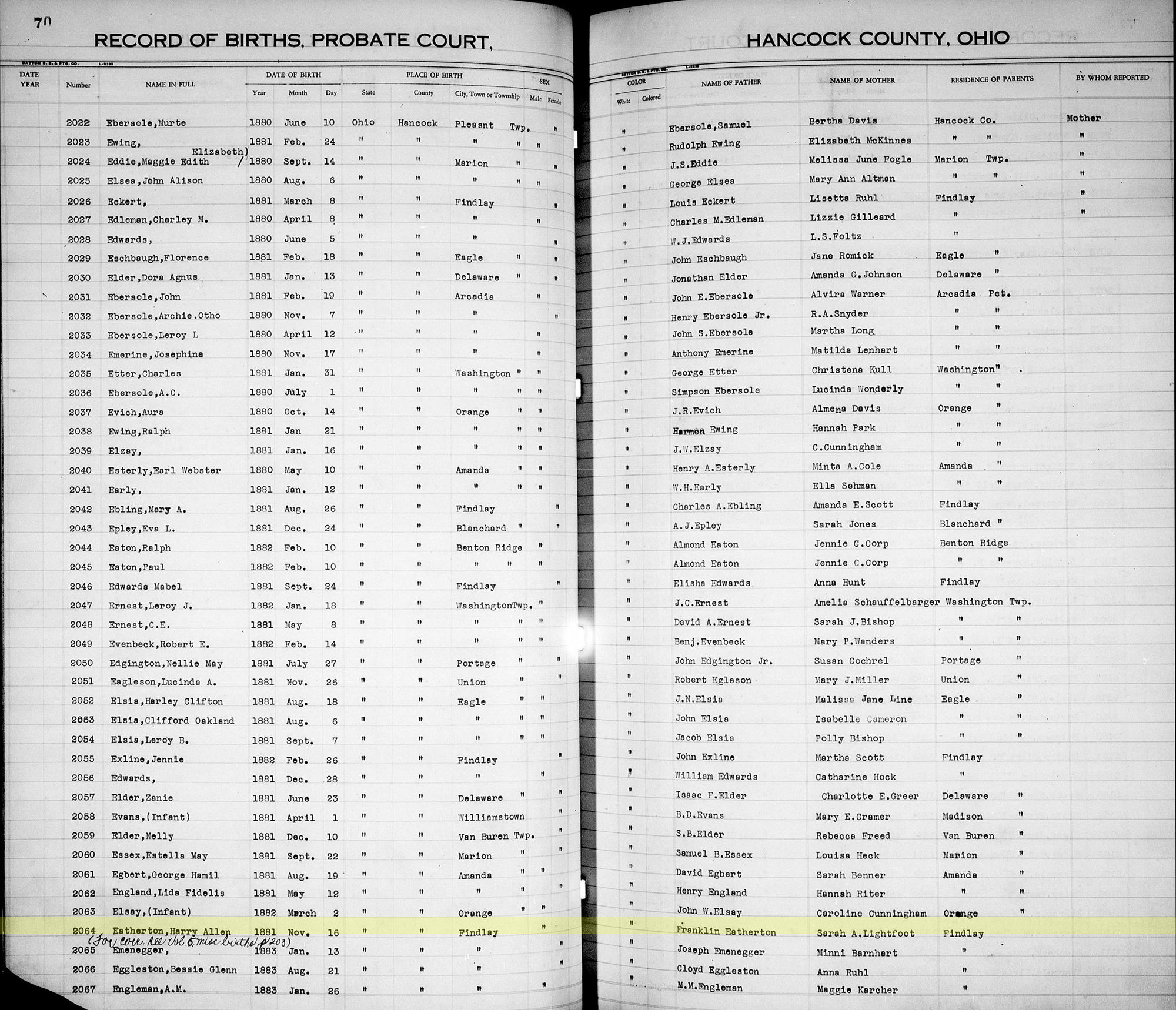 3 "Ohio, County Births, 1841-2003," database with images, FamilySearch (accessed 9 Jun 2014); Name: Harry Allen Eatherton; Event Date: 16 Nov 1881; Event Place: Findlay, Hancock, Ohio.