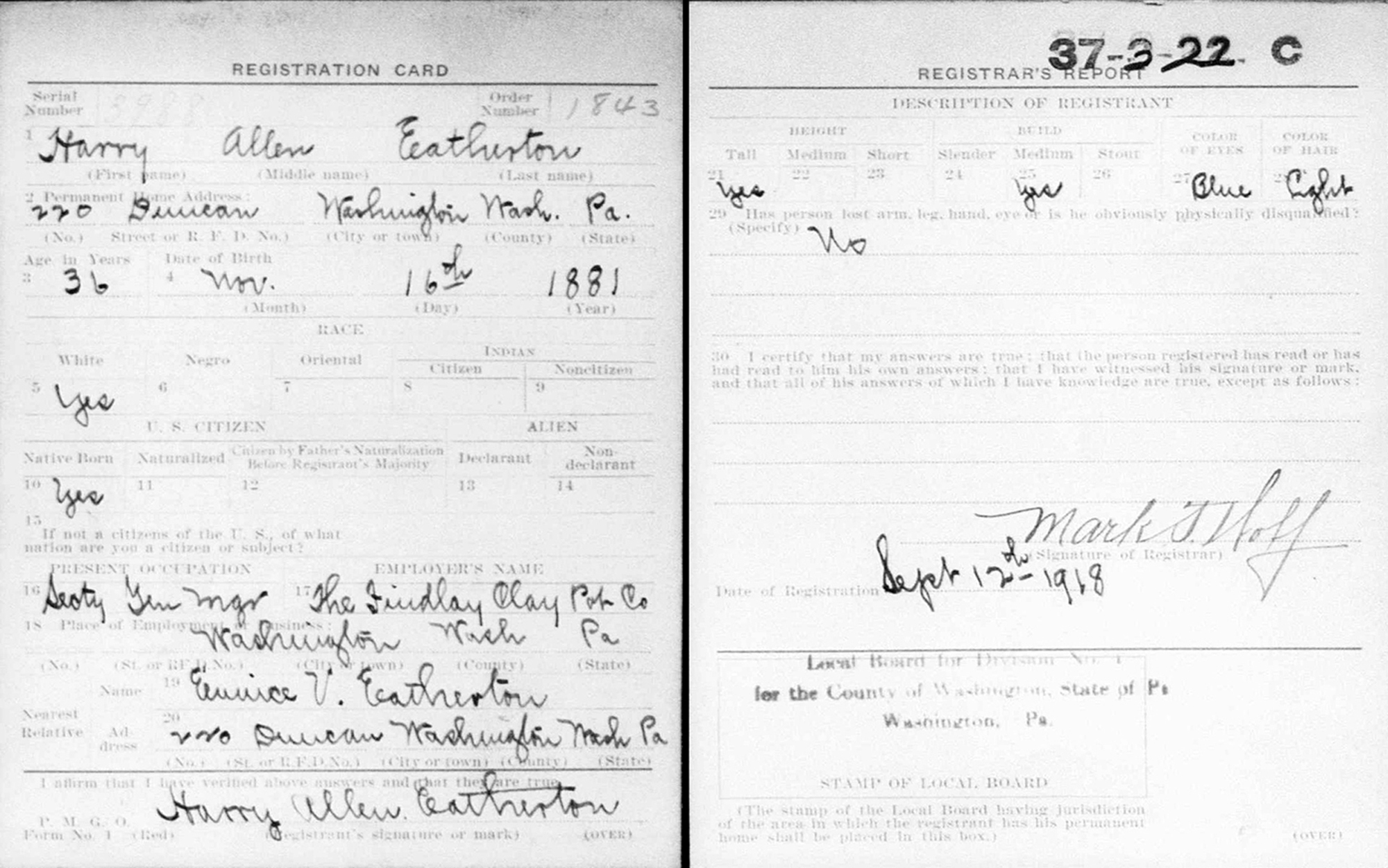 5 "United States World War I Draft Registration Cards, 1917-1918," database with images, FamilySearch.org (accessed 9 Jun 2014); Name: Harry Allen Eatherton; Event Place: Washington County no 1, Pennsylvania, United States.