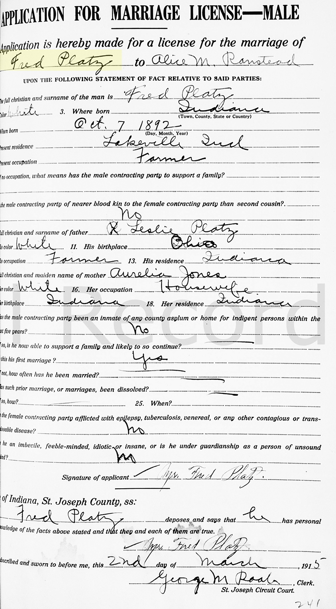 1 "Indiana Marriages, 1811-2019," database with images, FamilySearch (accessed 20 Feb 2020); Fred Platz and Alice M Ranstead, 02 Mar 1915; citing St. Joseph, Indiana, United States, Marriage Registration, Indiana Commission on Public Records, Indianapolis; FHL microfilm 005206300.