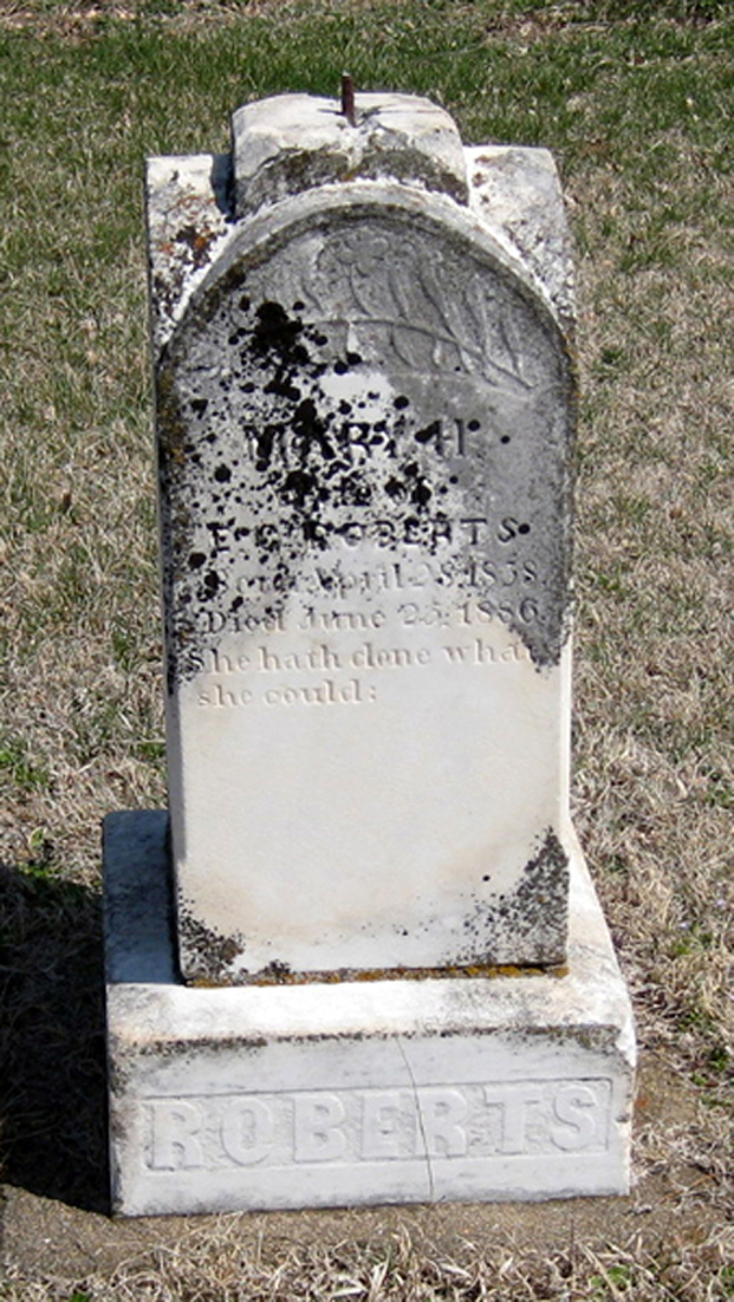 6 Find A Grave, database and images (https://www.findagrave.com/ ); accessed 26 April 2020, memorial page for Mary Holmes Roberts (28 Apr 1838-25 Jun 1886), Find a Grave Memorial no. 50719372, citing Devore Cemetery, Harper County, Kansas, USA