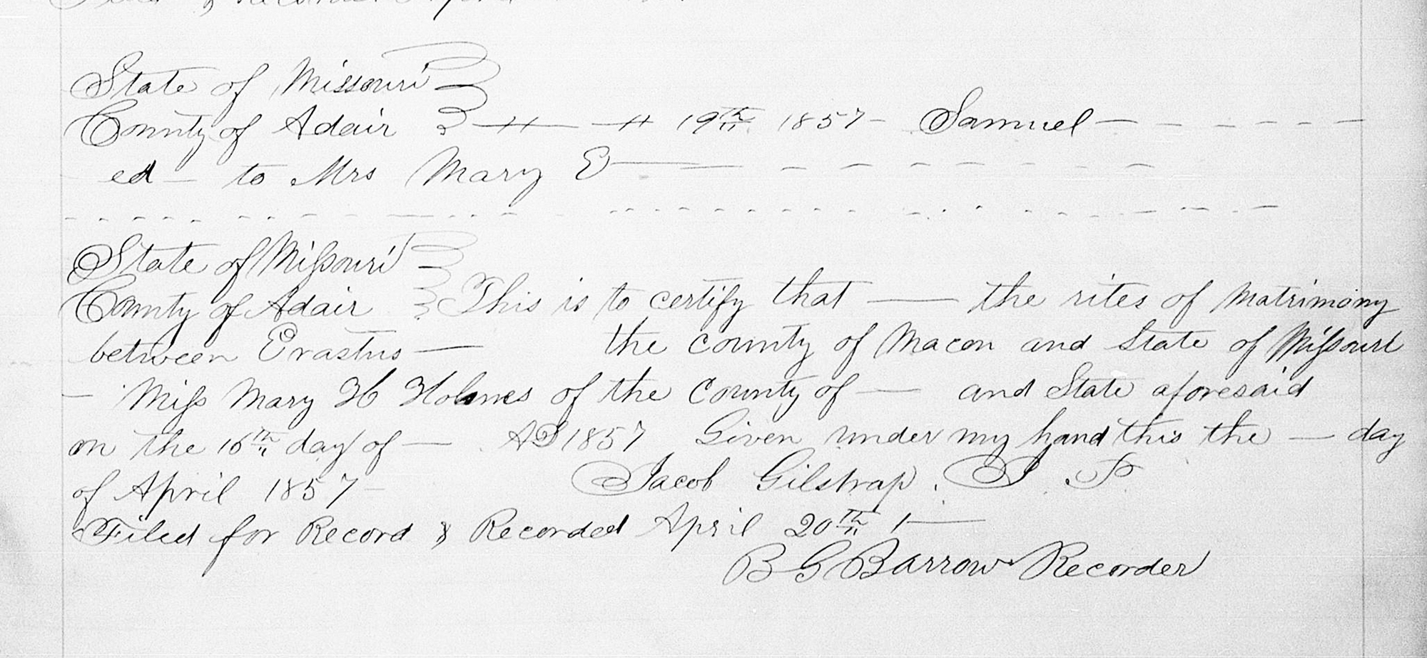 1 "Missouri, County Marriage, Naturalization, and Court Records, 1800-1991," database with images, FamilySearch (https://www.familysearch.org/search/collection/2060668 : accessed 29 May 2020), Miss Mary H Holmes in entry for Erastus, 1857; citing Marriage, Adair, Missouri, United States, Missouri State Archives, Jefferson City; FHL microfilm 007425721.
