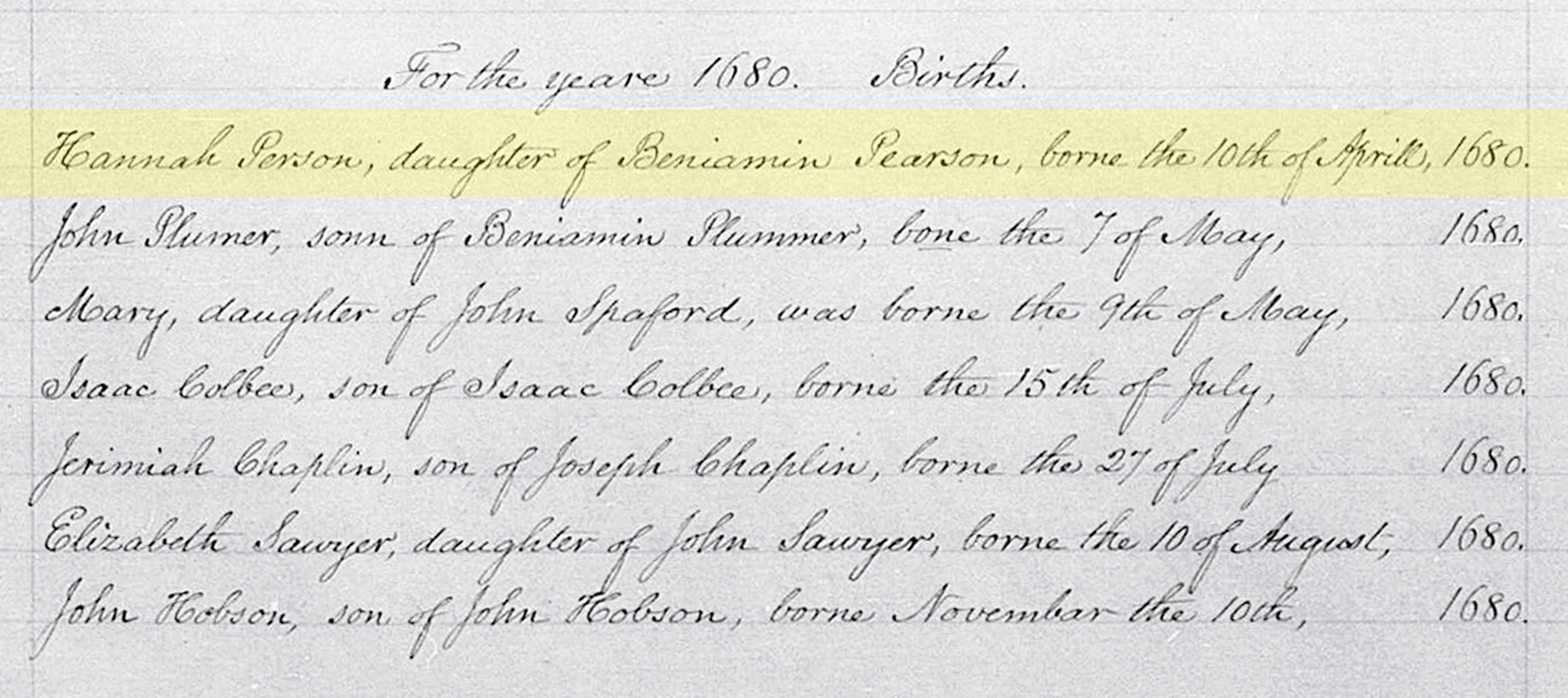 2 "Massachusetts Births and Christenings, 1639-1915," database, FamilySearch (https://www.familysearch.org/search/collection/1675197 : accessed 22 Jun 2020), Hannah Person, 1680.