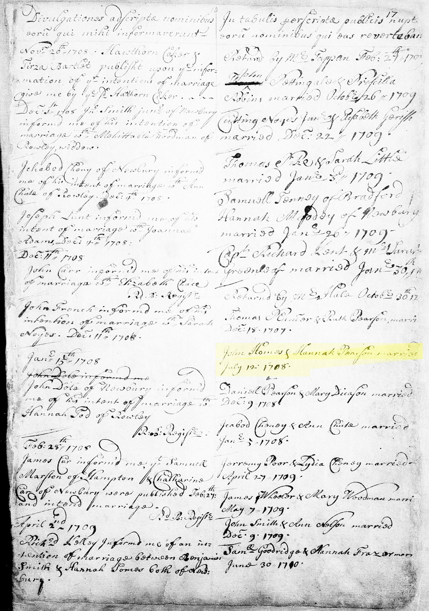 1 "Massachusetts, Town Clerk, Vital and Town Records, 1626-2001," database with images, FamilySearch (https://www.familysearch.org/search/collection/2061550 : accessed 22 Jun 2020), John Homes and Hannah Pearson, 12 Jul 1708; citing Marriage, Newbury, Essex, Massachusetts, United States, Massachusetts Secretary of the Commonwealth, Boston; FHL microfilm 007009724.