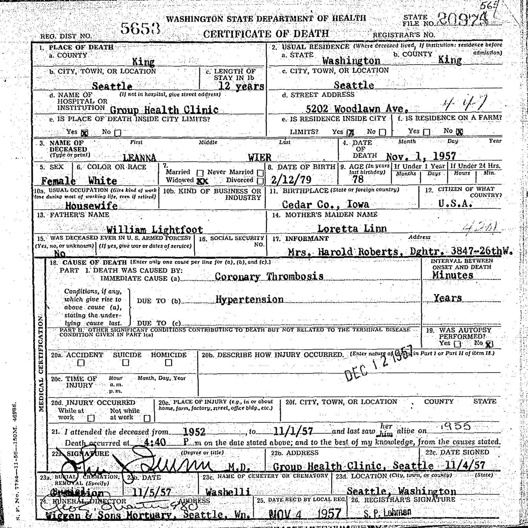 6 "Washington Death Certificates, 1907-1960," database, FamilySearch.org (accessed 13 Oct 2019), Leanna Wier, 1957; citing Seattle, King, Washington, reference 20974 5653, Bureau of Vital Statistics, Olympia; FHL microfilm 2,033,740.