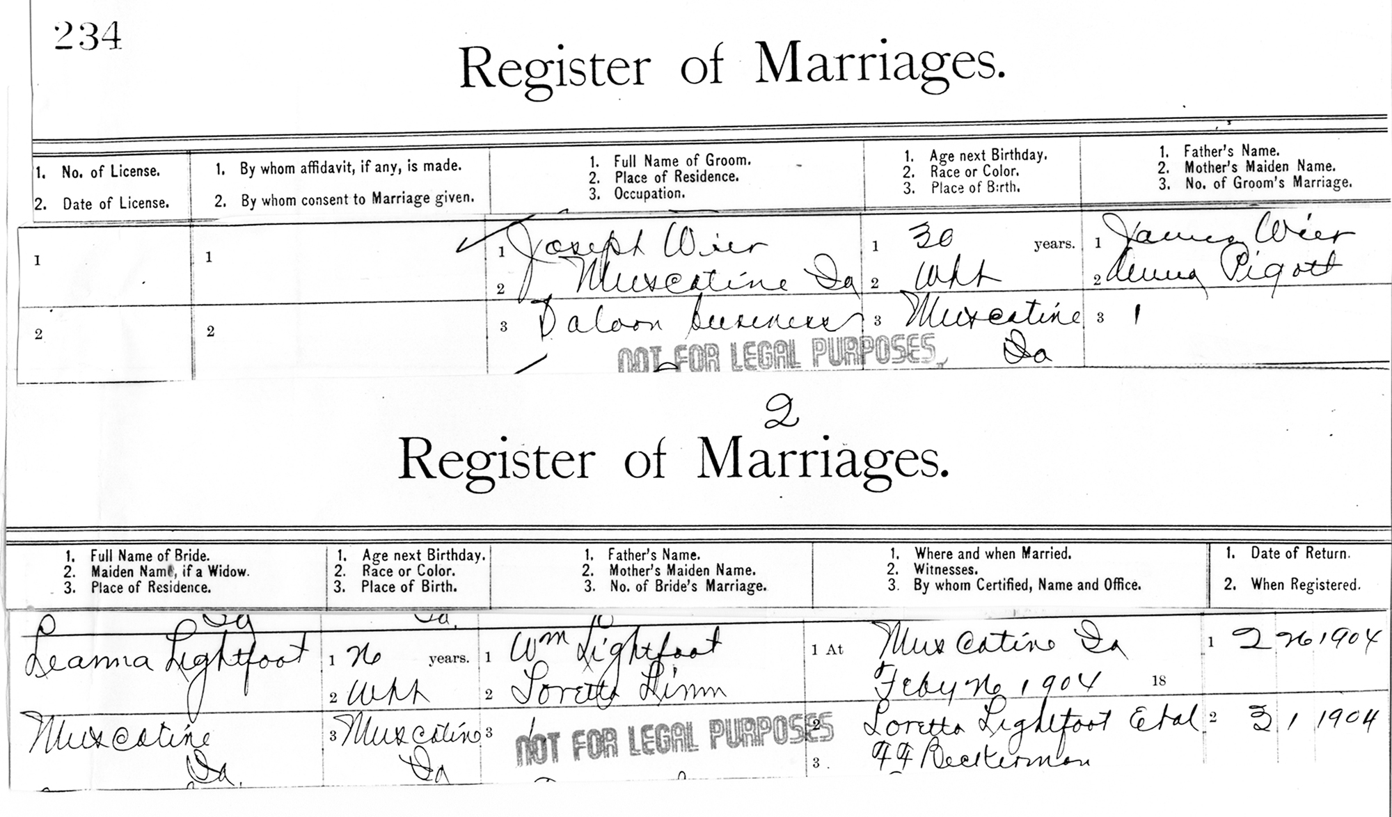 2 "Iowa, County Marriages, 1838-1934," database, FamilySearch (https://familysearch.org/search/collection/1805551 : accessed 13 Oct 2019), Joseph Wier and Leanna Lightfoot, 26 Feb 1904, Muscatine, Iowa, United States; citing reference 1003492 pg 234, county courthouses, Iowa; FHL microfilm 1,003,492.