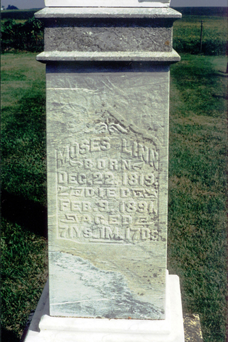 6 1860 U.S. census, population schedule, Iowa Township, Cedar County, Iowa, p. 150, family 1041, Moses Linn and Hannah Darner; index and images, FamilySearch.org (accessed 13 Jan 2014); citing National Archives and Records Administration microfilm M653.