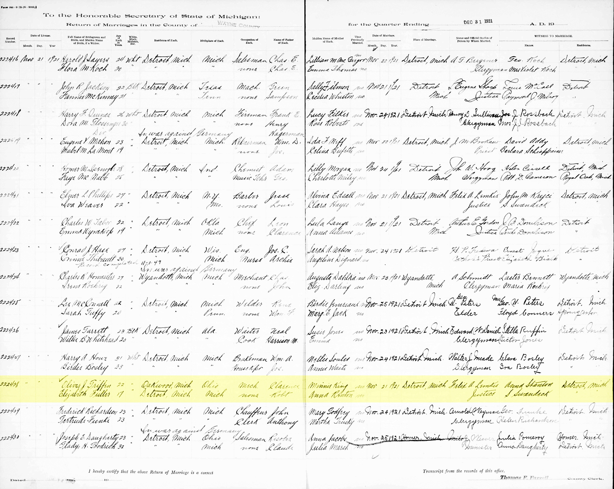 1 "Michigan Marriages, 1868-1925," database with images, FamilySearch (accessed 23 Feb 2020), Oliver J. Griffen and Elizabeth Fuller, 1921.