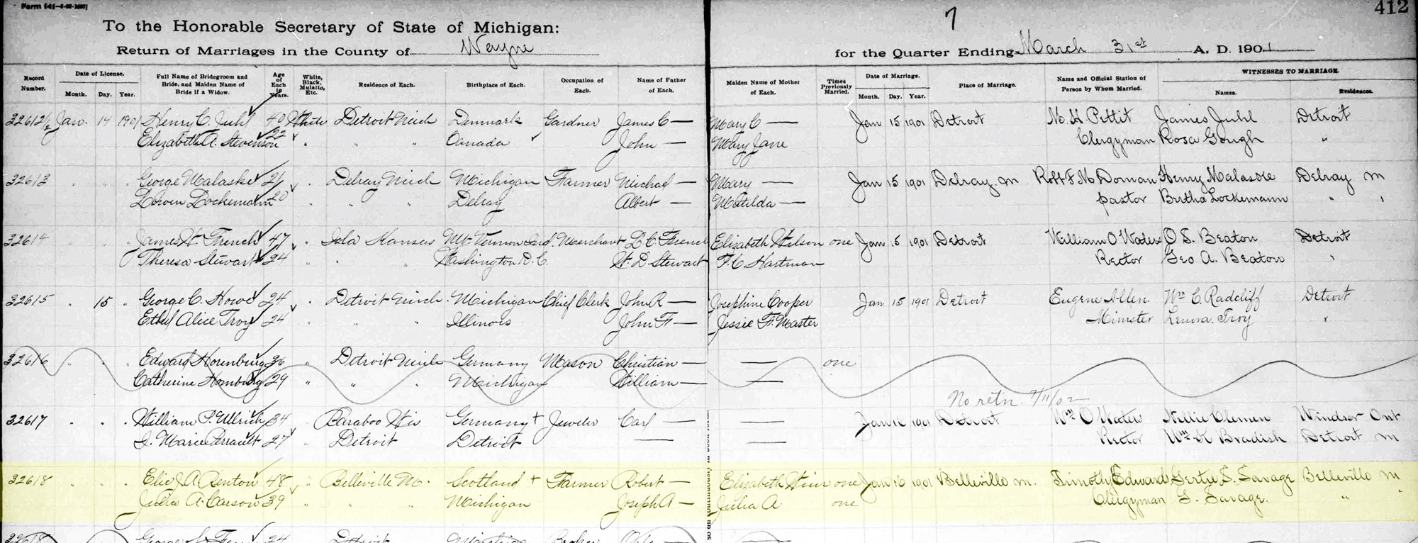 1 "Michigan Marriages, 1868-1925," database with images, FamilySearch (accessed 17 January 2021), (https://www.familysearch.org/ark:/61903/1:1:N38P-PPV : 9 November 2020), Elic J.a. Renton and Julia A. Carson, 16 Jan 1901; citing Marriage, Belleville, Wayne, Michigan, Citing Secretary of State, Department of Vital Records, Lansing; FHL microfilm 4032373.