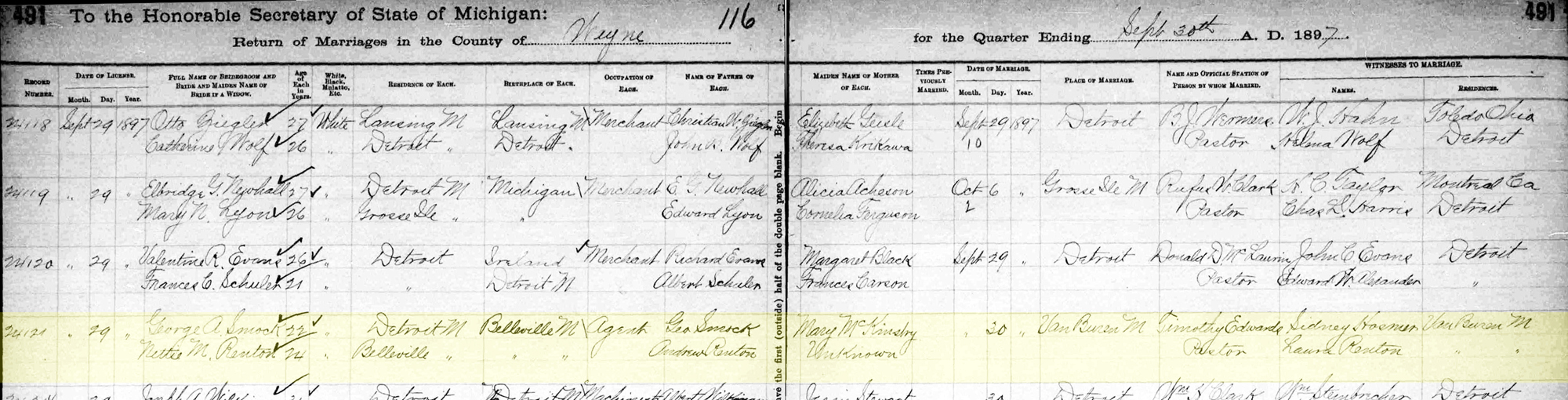 • Marriage Image: 30 September 1897, in Van Buren Township, Wayne County, MI. 1 • They appeared on the 1900 US Census in Wyandotte, MI on 13 June 1900. 2