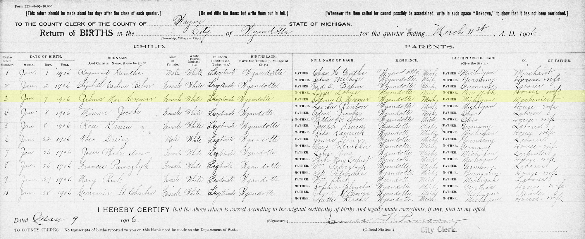 2 1910 U.S. census, population schedule, Wyandotte, Wayne County, Michigan, enumeration district (ED) 310, sheet 15B, family 267, Sidney Belmont Hosmer and Levora Renton; index and images, FamilySearch.org (accessed 25 Dec 2015); citing National Archives and Records Administration microfilm T624, roll 679.