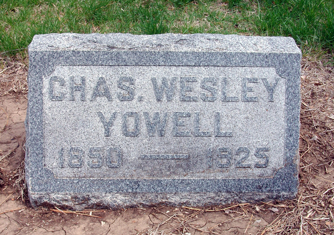 6 Find A Grave, database and images (https://www.findagrave.com/ ); (accessed 12 August 2019), memorial page for Charles Wesley Yowell (4 Aug 1850\endash 7 Apr 1925), Find A Grave Memorial no. 76147126, citing McPherson Cemetery, McPherson, McPherson County, Kansas, USA