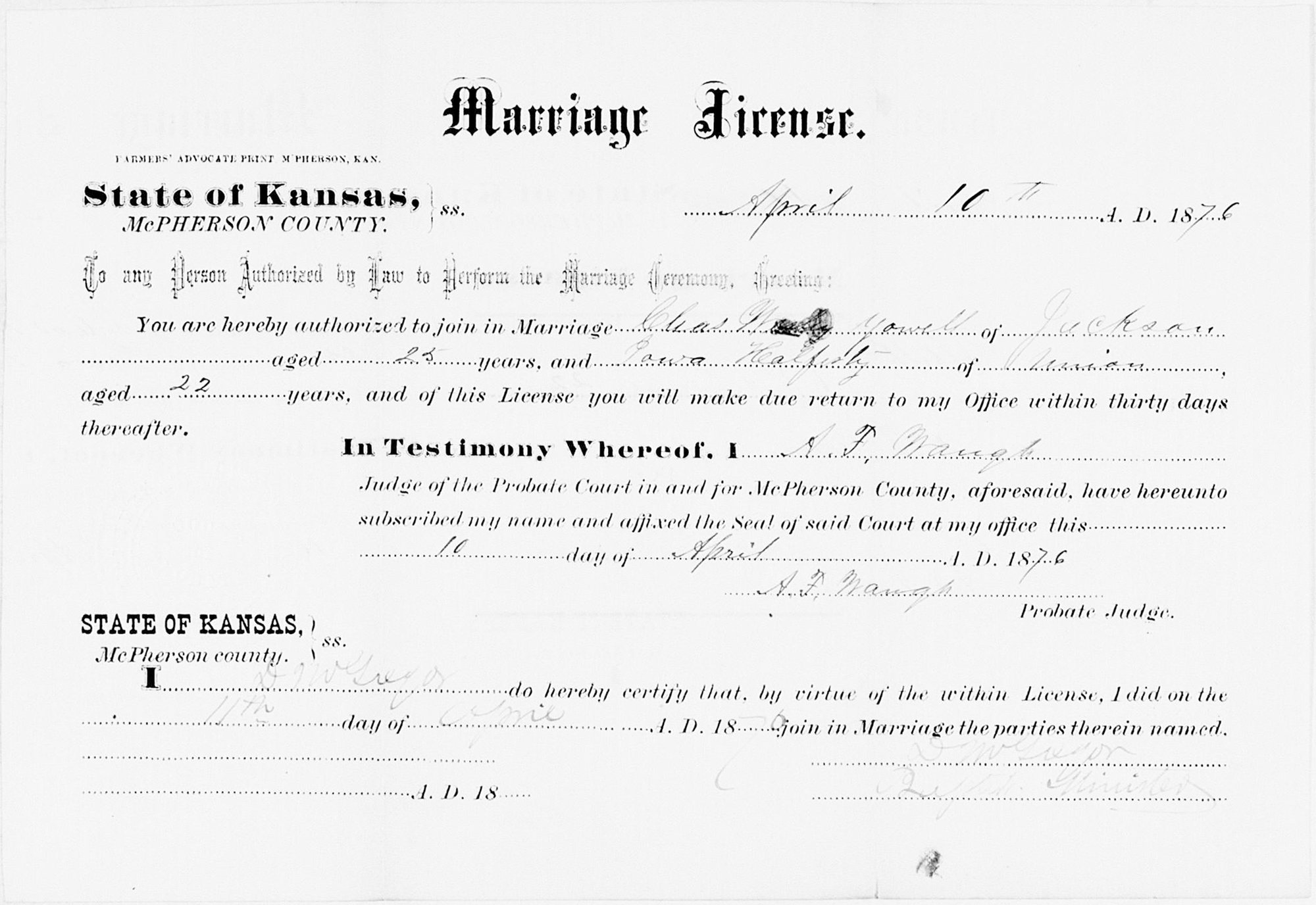 1 "Kansas County Marriages, 1855-1911," database with images, FamilySearch (https://www.familysearch.org/search/collection/1851040 : accessed 12 Aug 2019), Chas W Yowell and Iowa Halferty, 11 Apr 1876; citing Marriage, McPherson, Kansas, United States, district clerk, court clerk, county clerk and register offices from various counties; FHL microfilm 2,297,303.