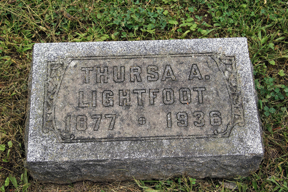 • She was buried after 14 December 1936 in the Freeport Cemetery in Freeport, MI. Thursa married Otto Ray Lightfoot, son of James Lightfoot and Mary Amanda Yoha, on 22 December 1900 in Freeport, MI.1 2 3 4 (Otto Ray Lightfoot was born on 27 January 1876 in Mansfield, OH,6 7 died on 14 November 1954 8 and was buried after 14 November 1954 in Freeport, MI 8.)
